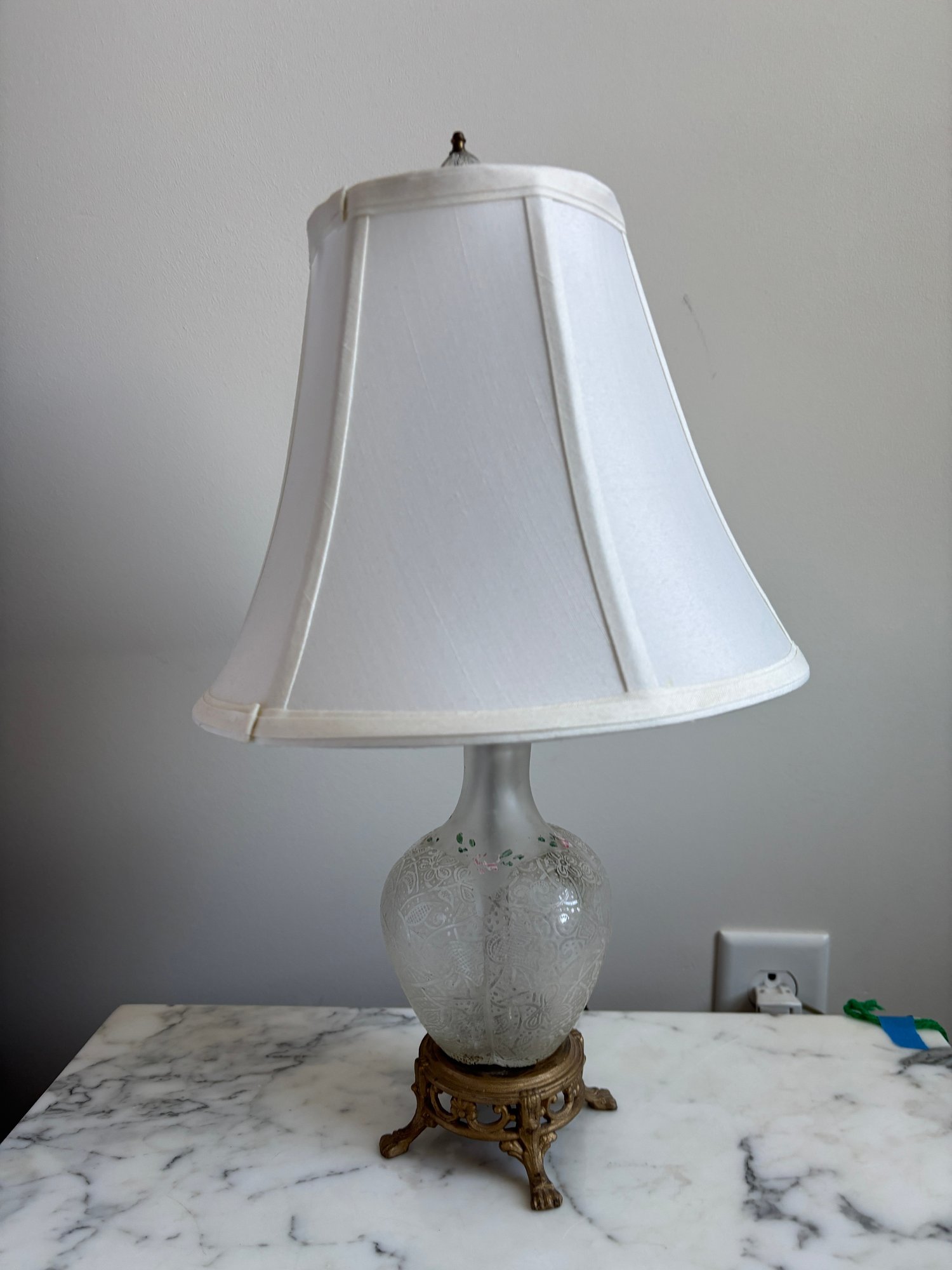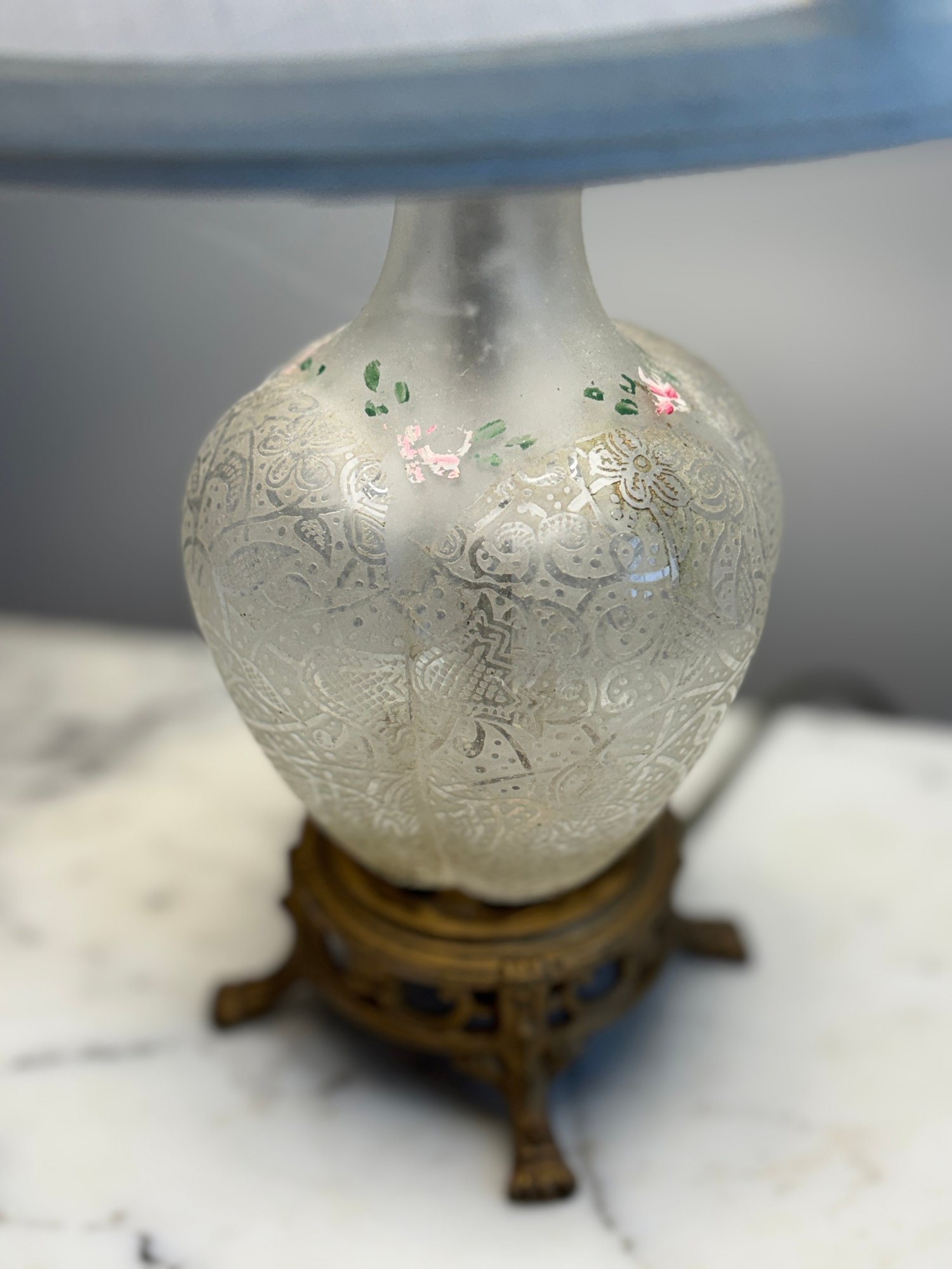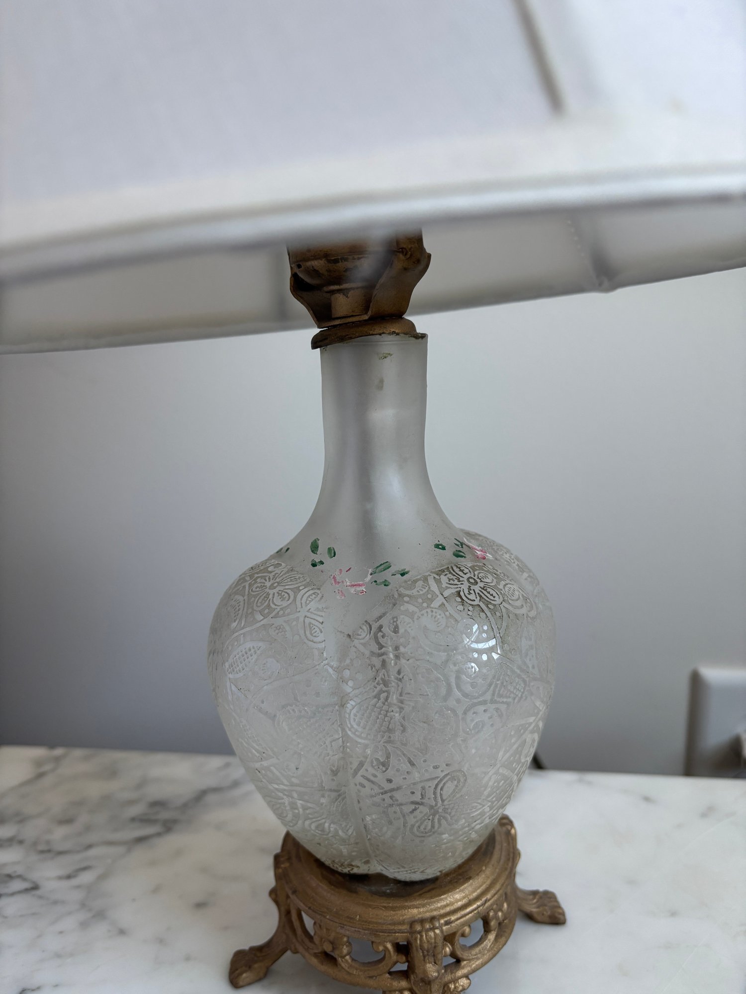 Vintage frosted glass vase or decanter featuring an etched pattern and hand-painted floral details.