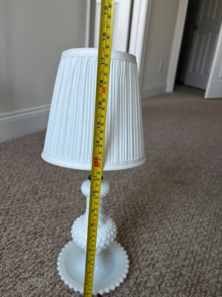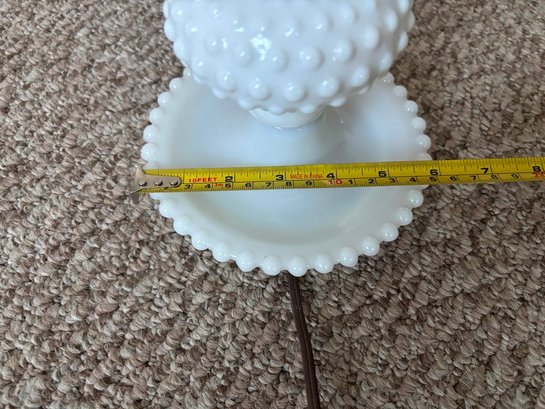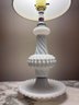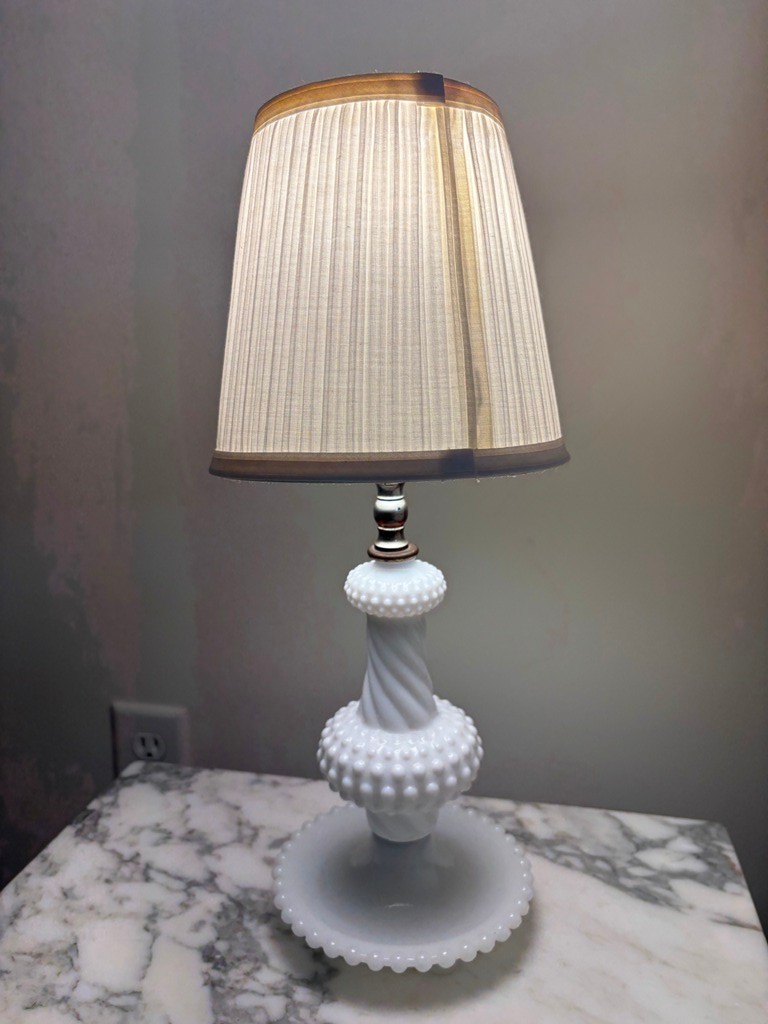 Vintage white milk glass hobnail table lamp, with textured hobnail pattern.