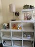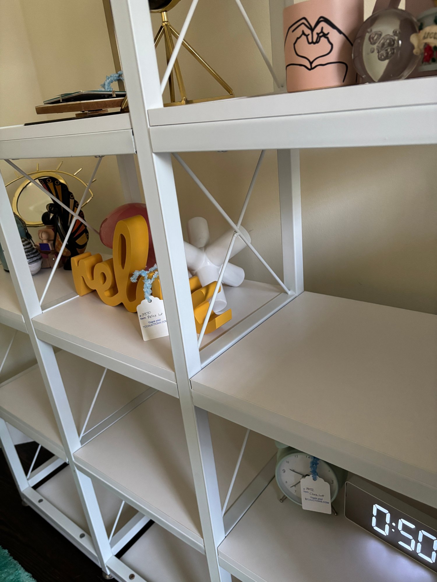 Popular for their "airy" silhouette and versatility in modern or industrial-inspired home decor, this white metal etagere bookcase has a stepped/geometric design.