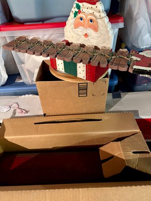 Beautiful wood advent calendar with trinkets in the drawers. Also included is assorted christmas decor.
