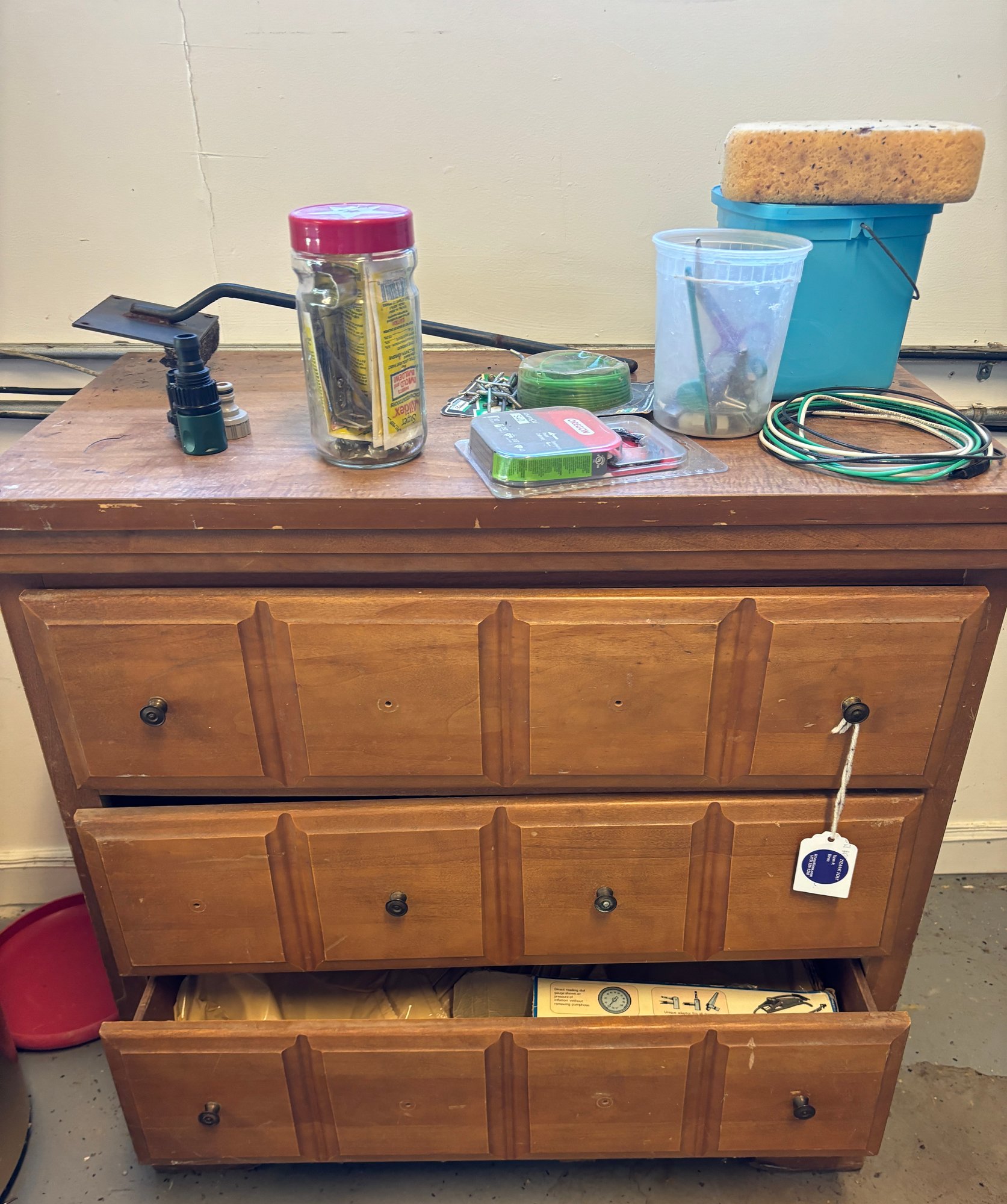 Notes: The cabinet drawers have a problem staying parallel. Contents are in various stages of use