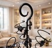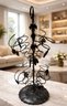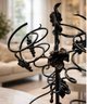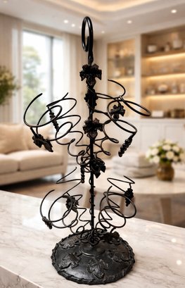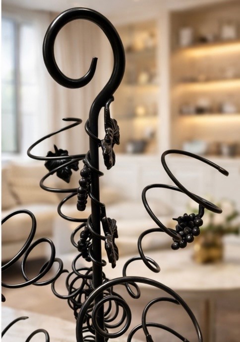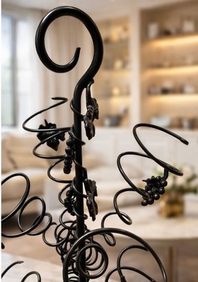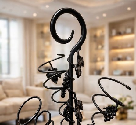 Black wrought iron wine tree rack designed to hold multiple bottles of wine in decorative metal spirals.