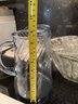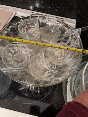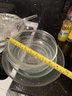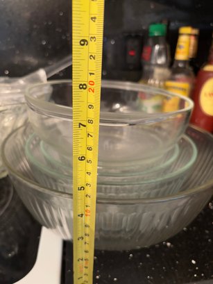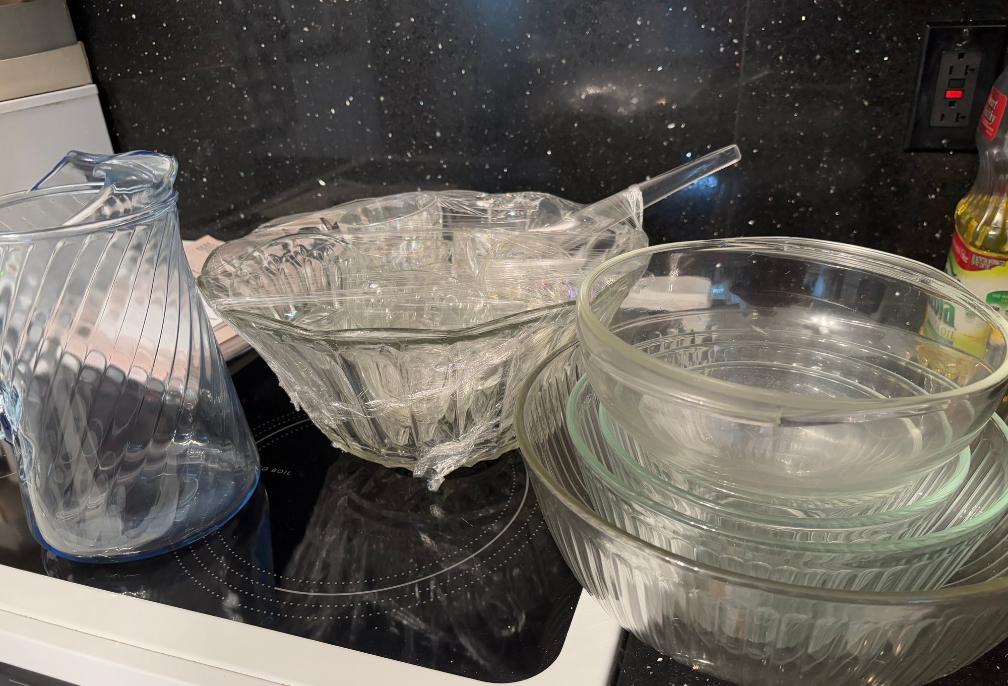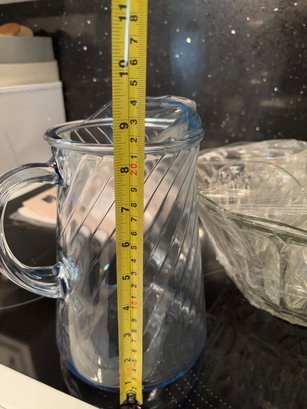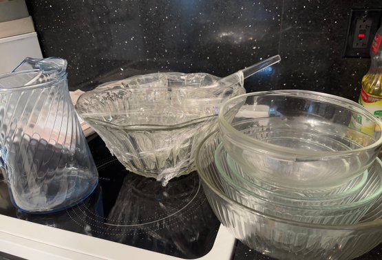 assortment of pyrex bowls, a punch bowl set and a glass pitcher.