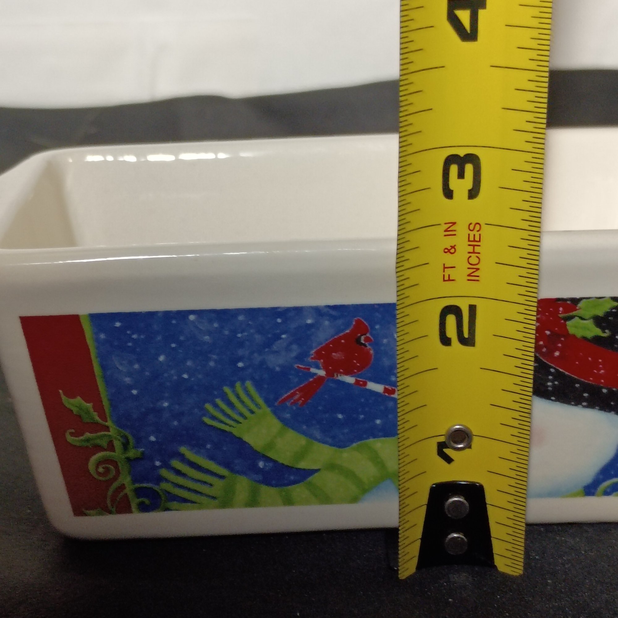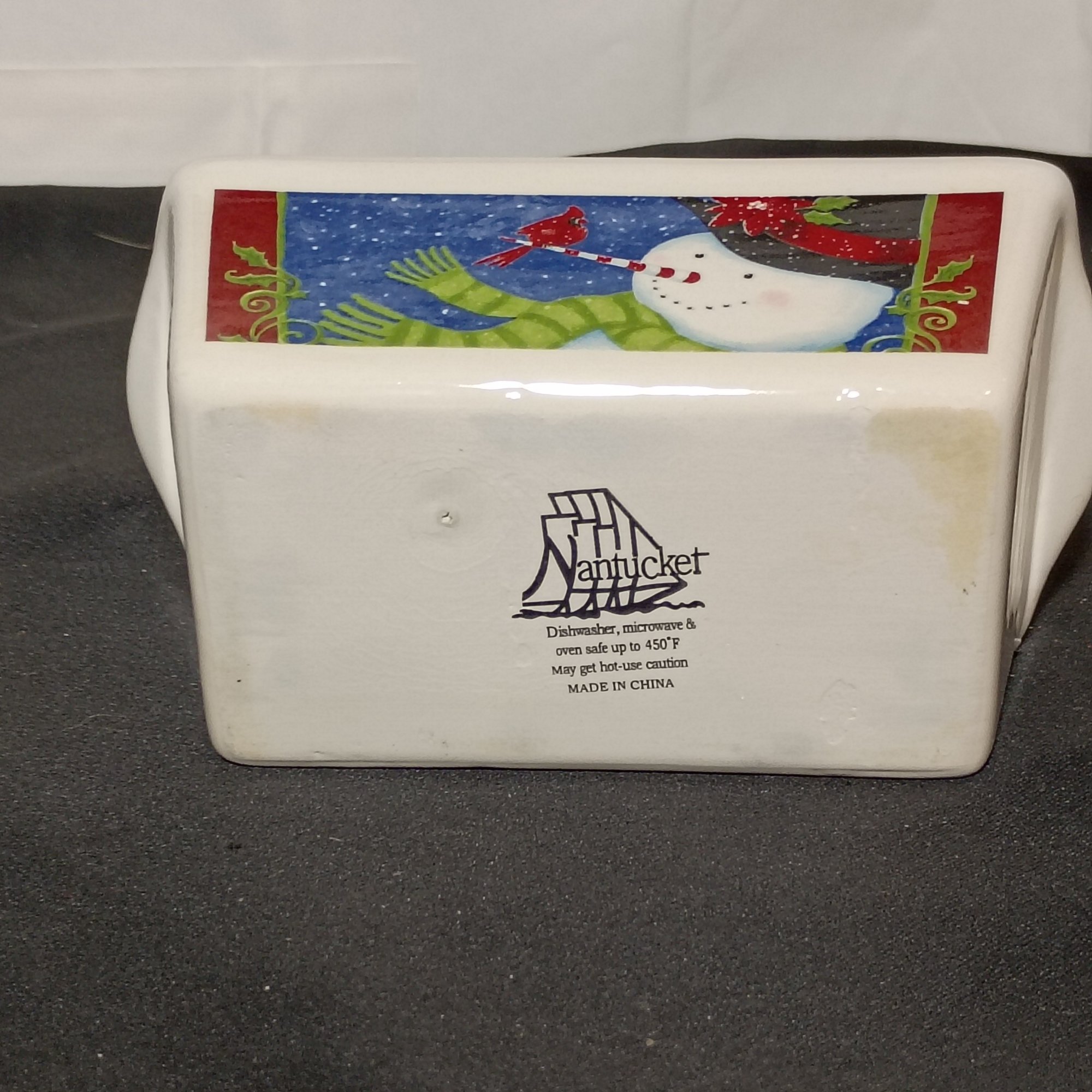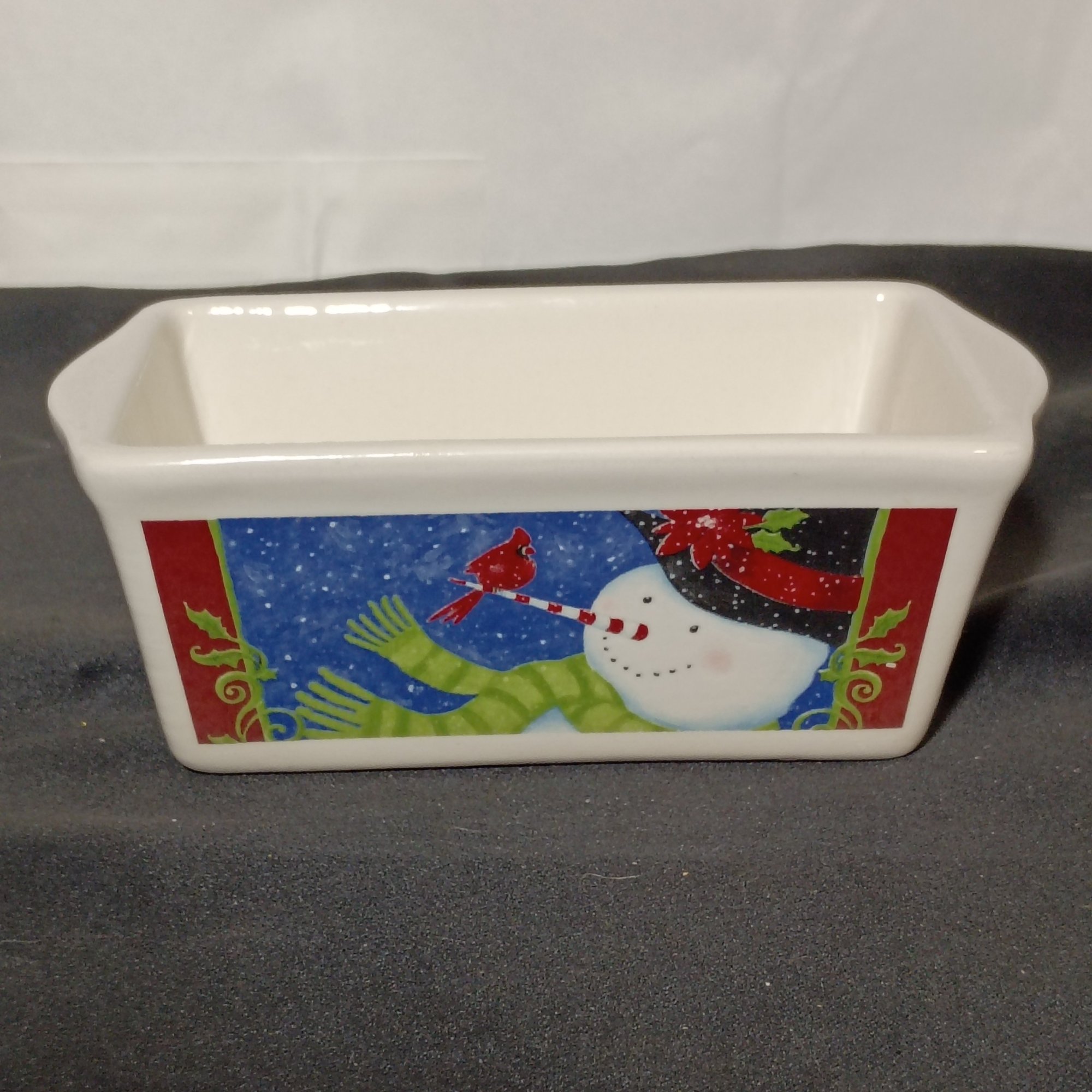 Ceramic Mini Loaf Pan By Nantucket Which Features A Festive Snowman And Cardinal Holiday Design (NM)