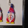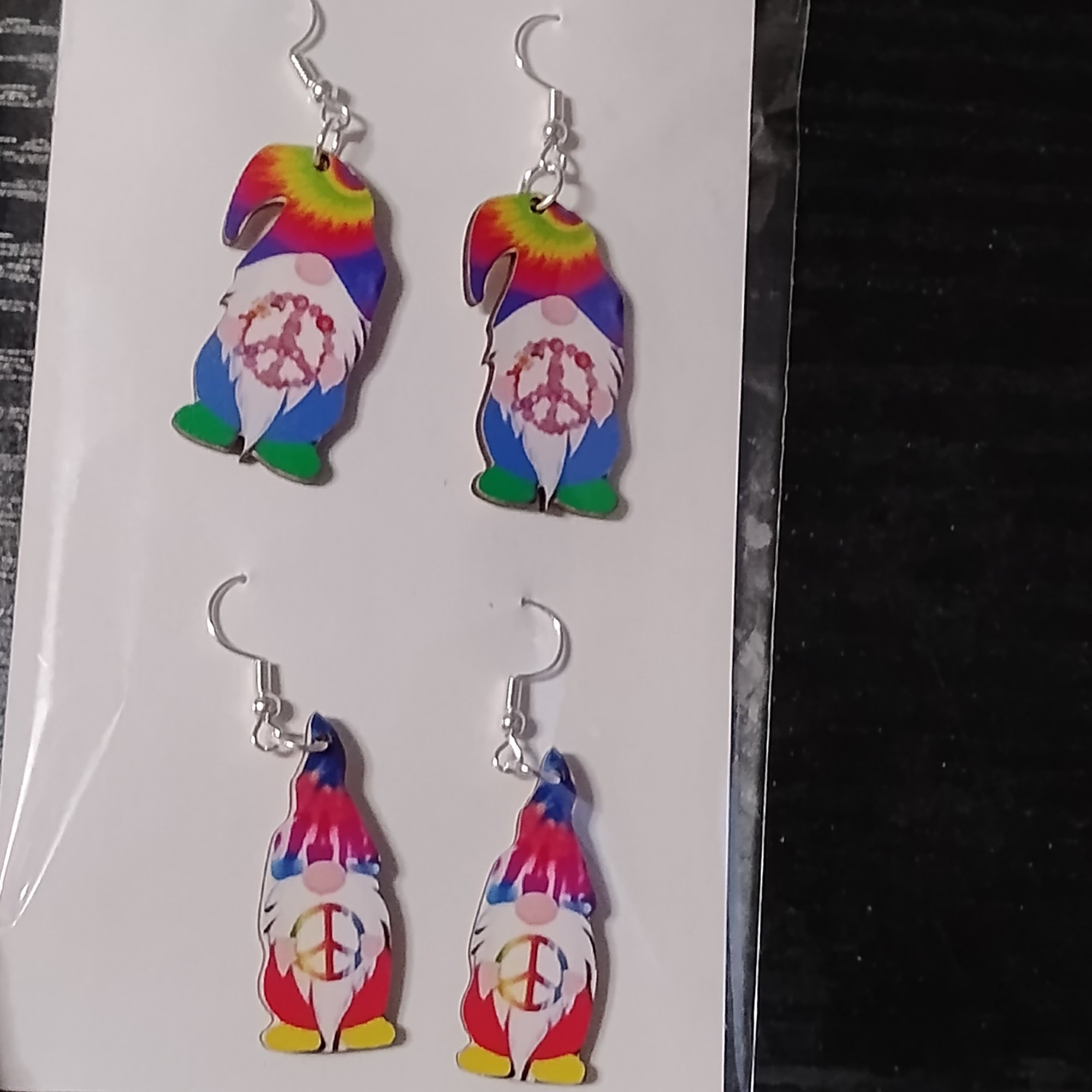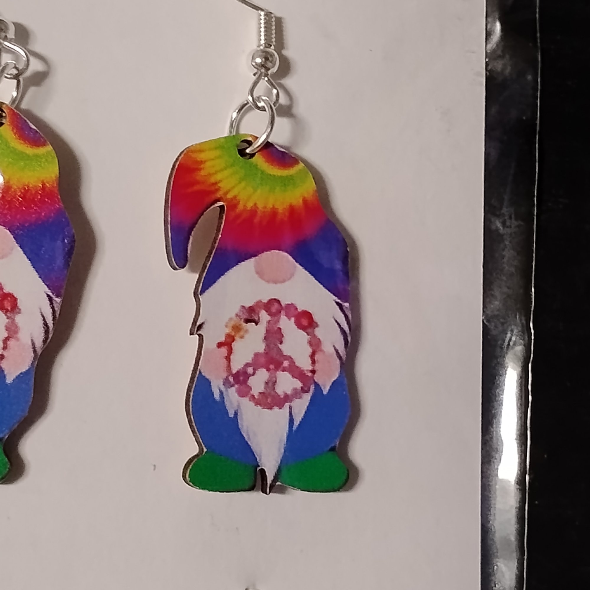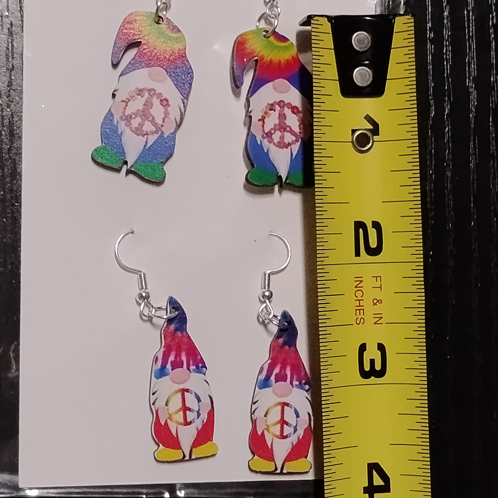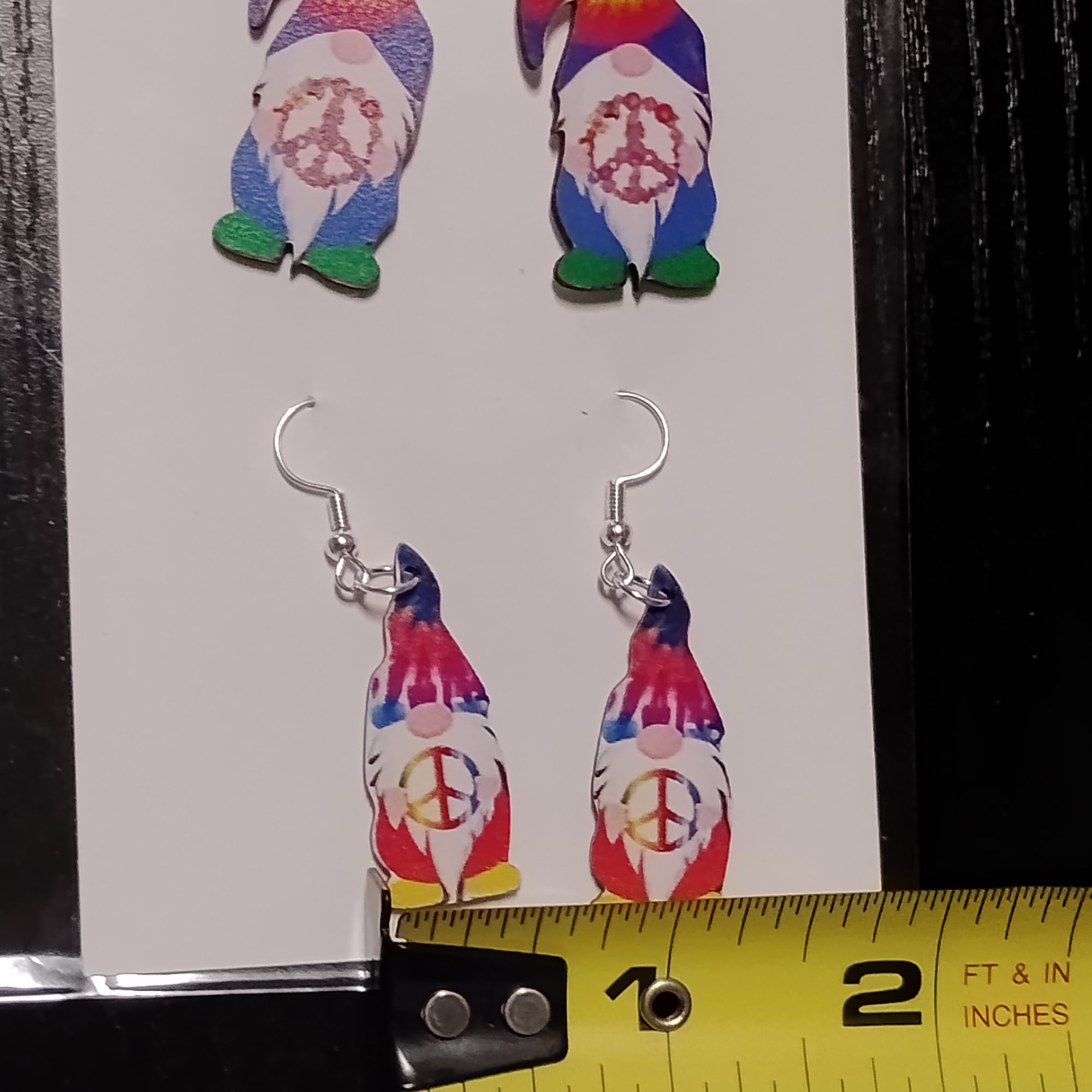 Dangle-style Tie-dyed Wooden Gnome Earrings Feature A Peace Sign Design (NM)