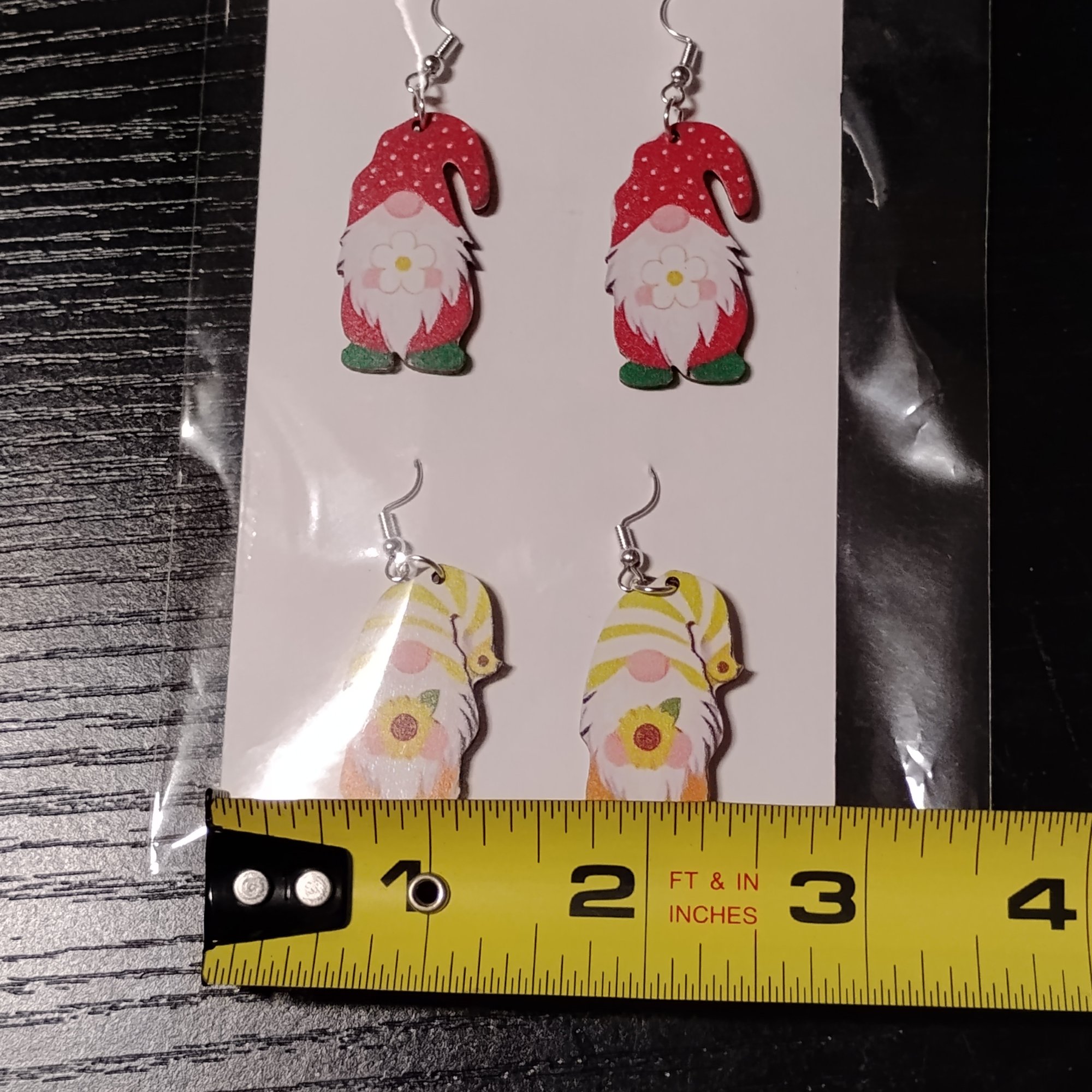 Dangle-style Wooden Gnome Earrings Feature Spring Flower Designs (NM)