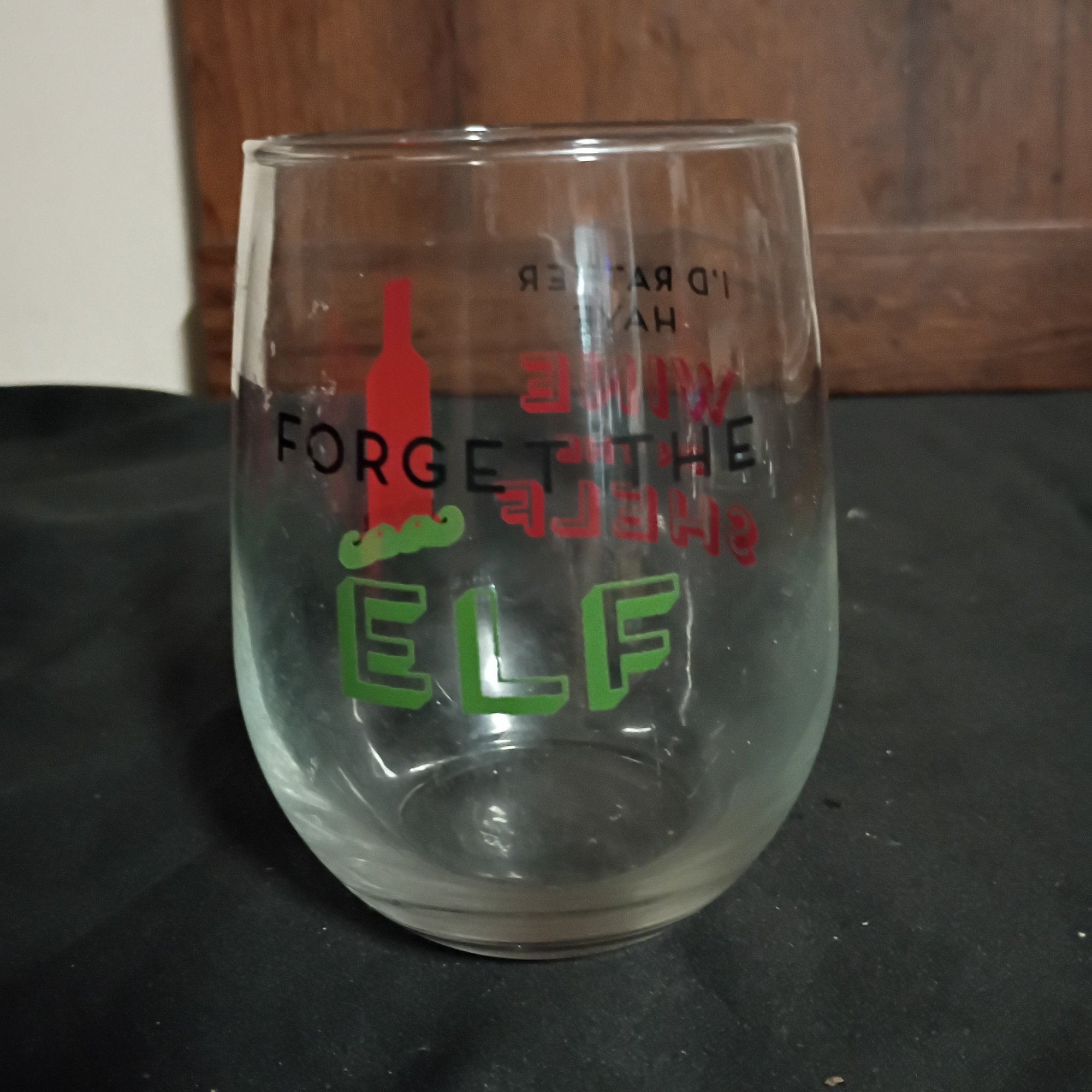 Royal Norfolk stemless wine glass is a 17-ounce Christmas-themed cup featuring the humorous quote "Forget the elf... I'd rather have wine on the shelf