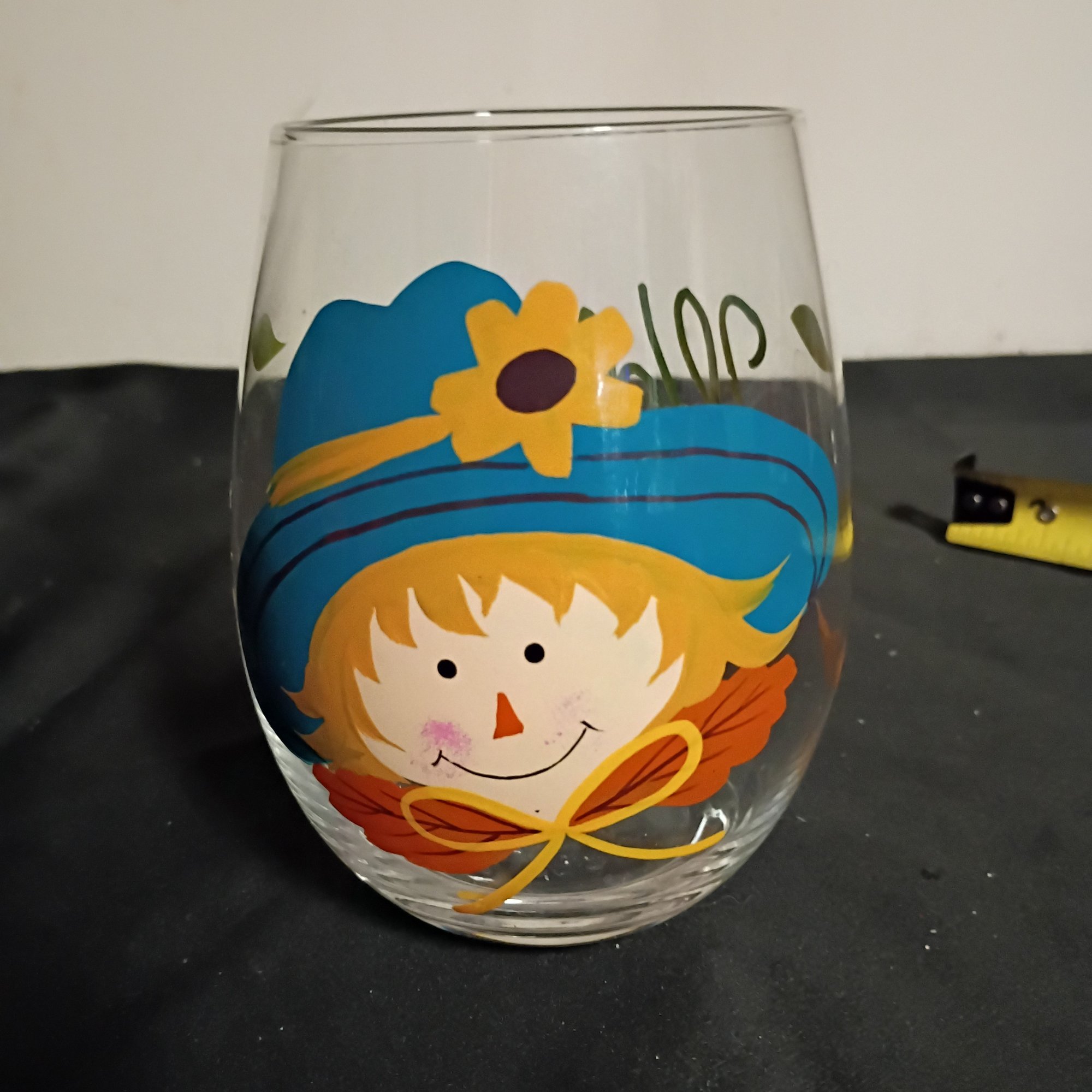Hand-painted "Hello Fall" Stemless Wine Glass Featuring Autumn Foliage And Festive Text(NM)