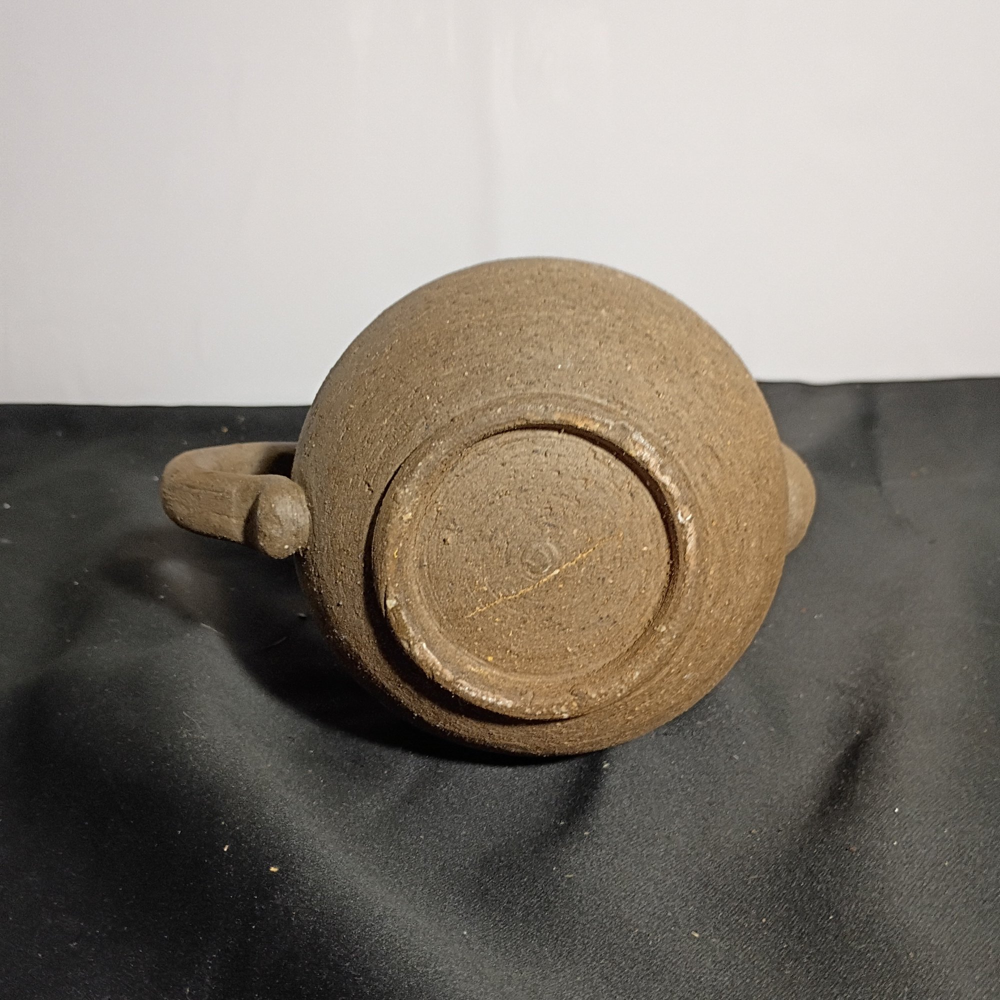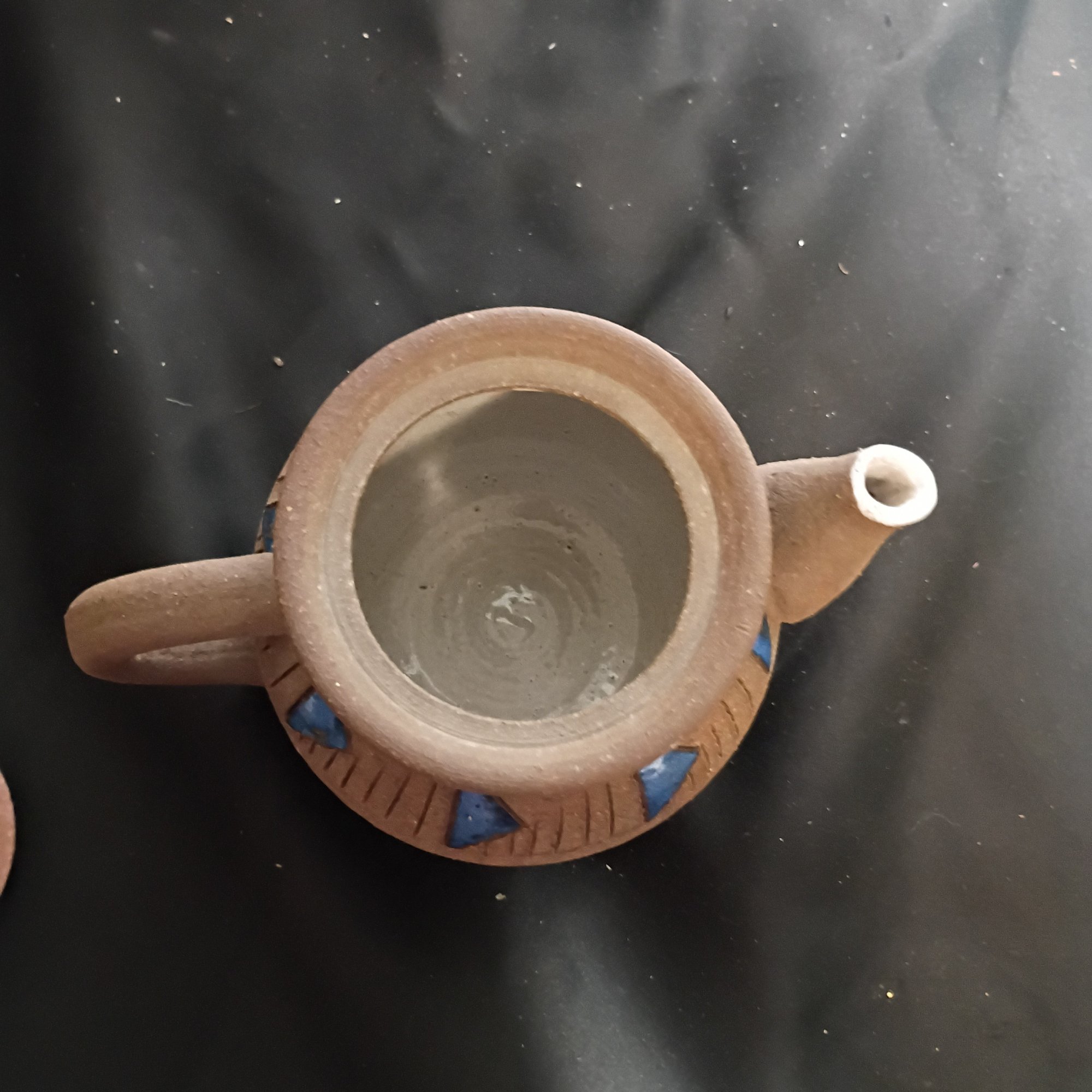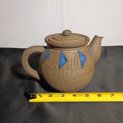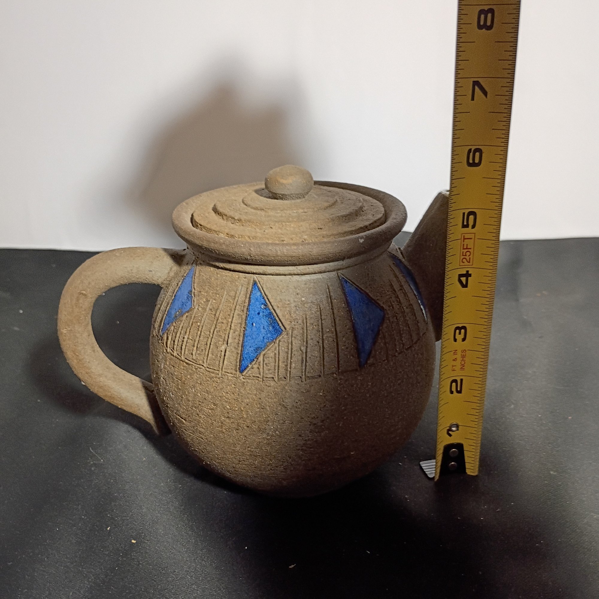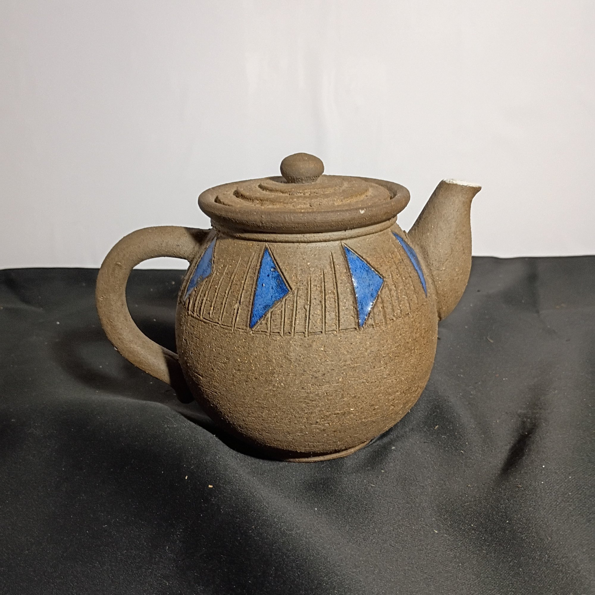 Handcrafted Studio Art Pottery Teapot Made From Textured Brown Clay With Blue Geometric Pattern (NM)
