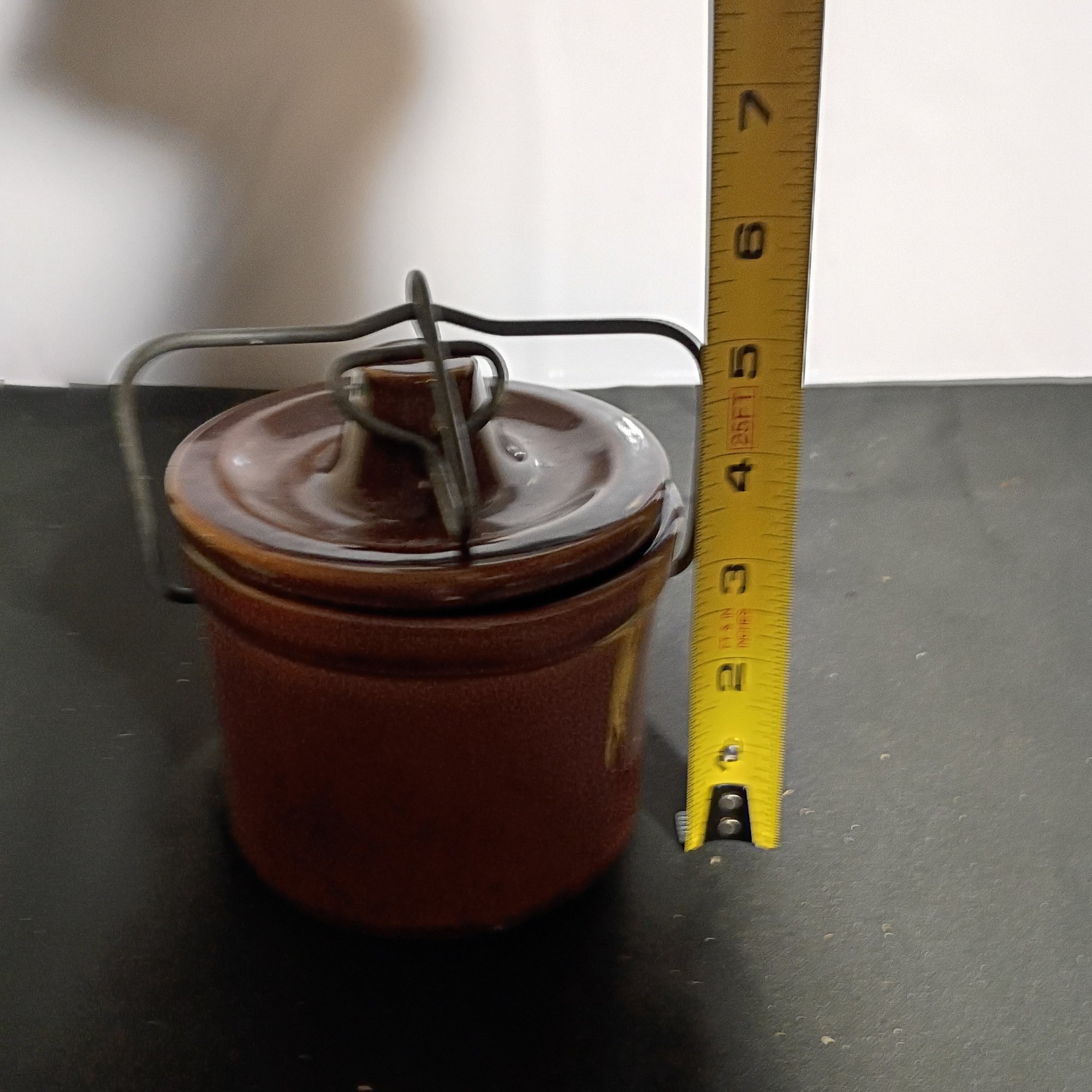 Vintage Brown Glazed Stoneware Crock Featuring A Metal Wire Handle And Locking Lid (NM)