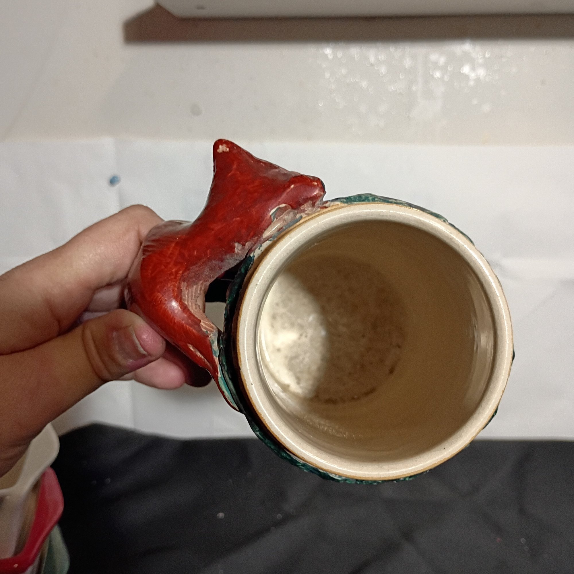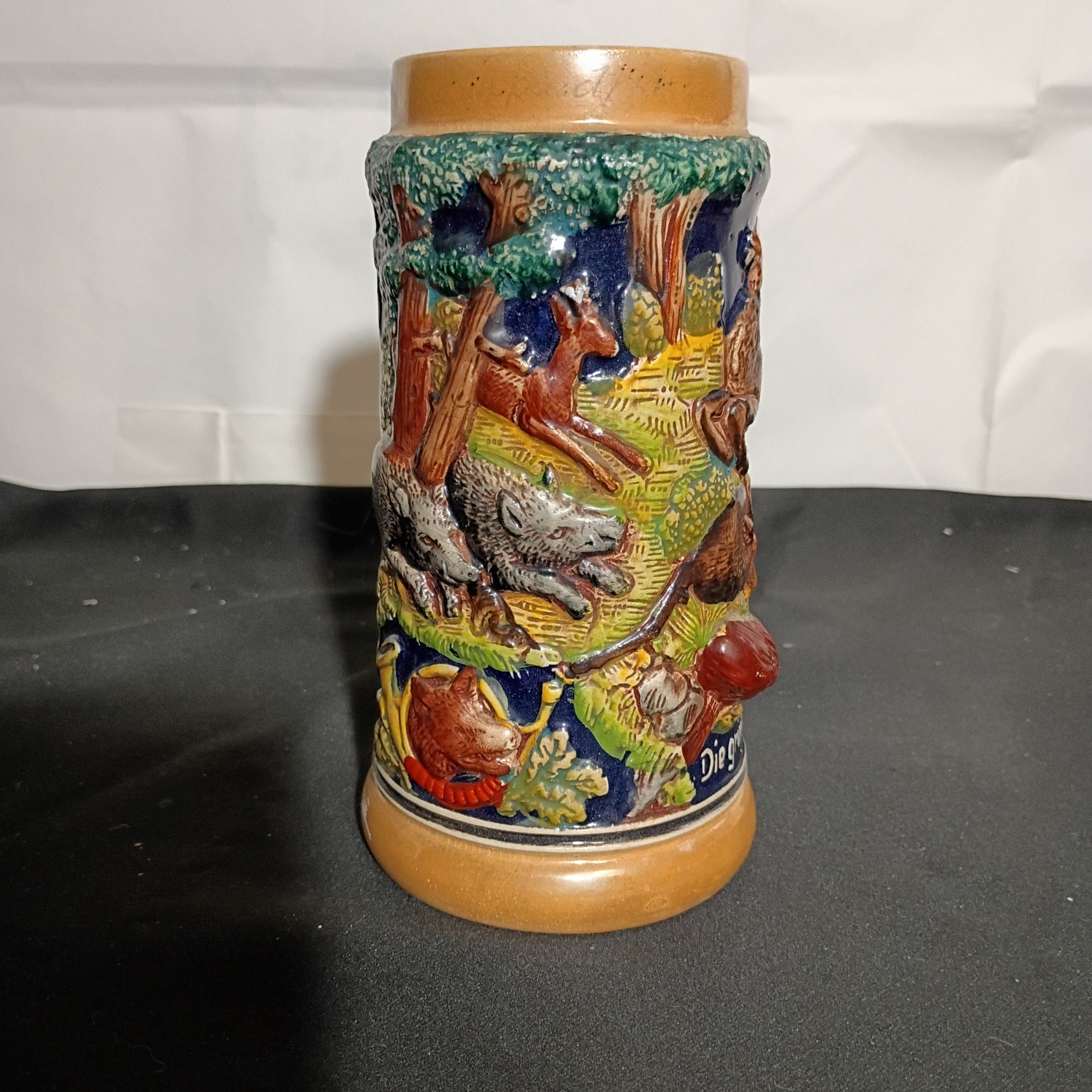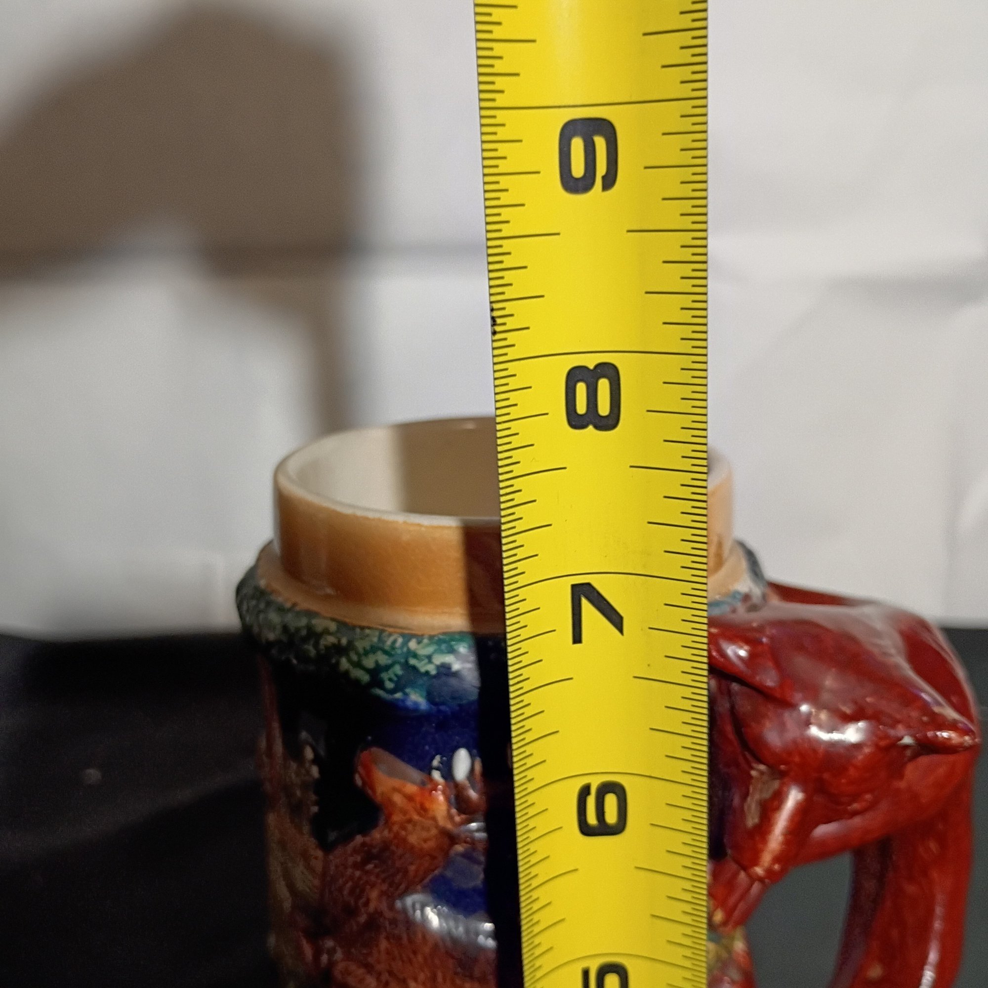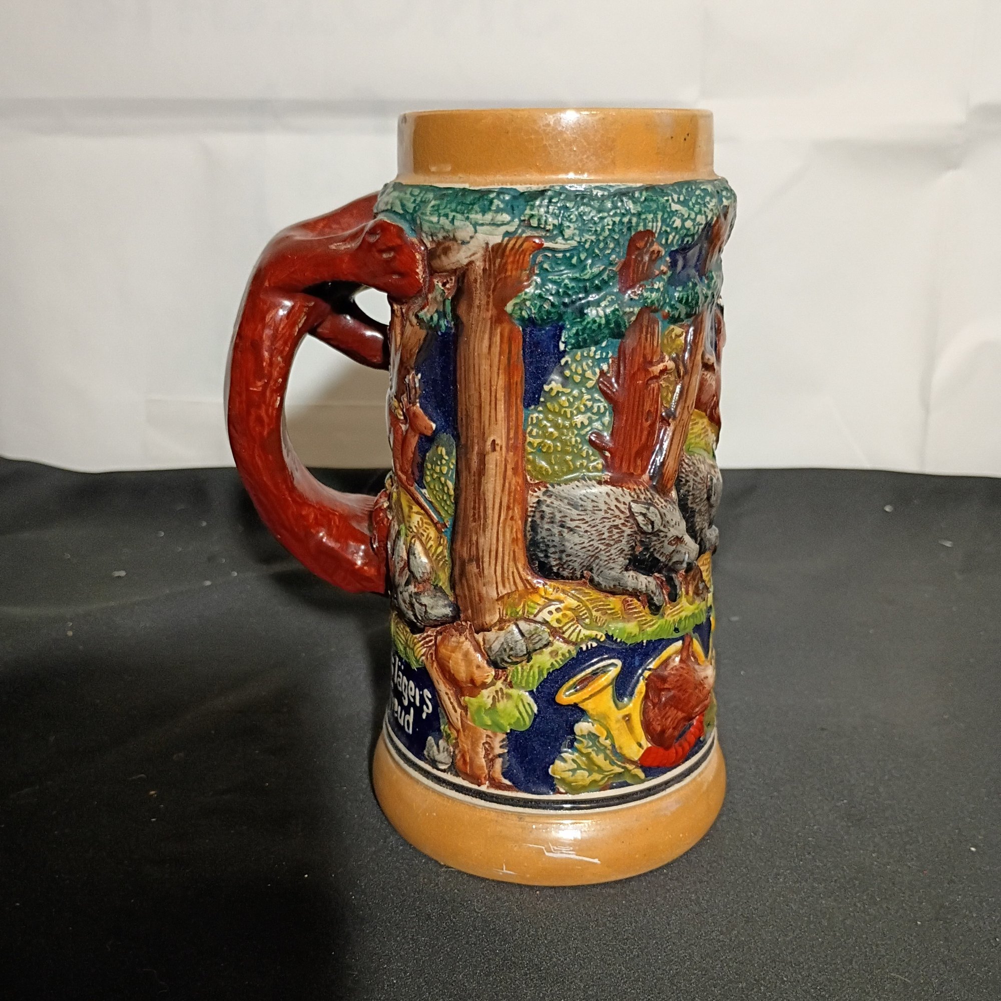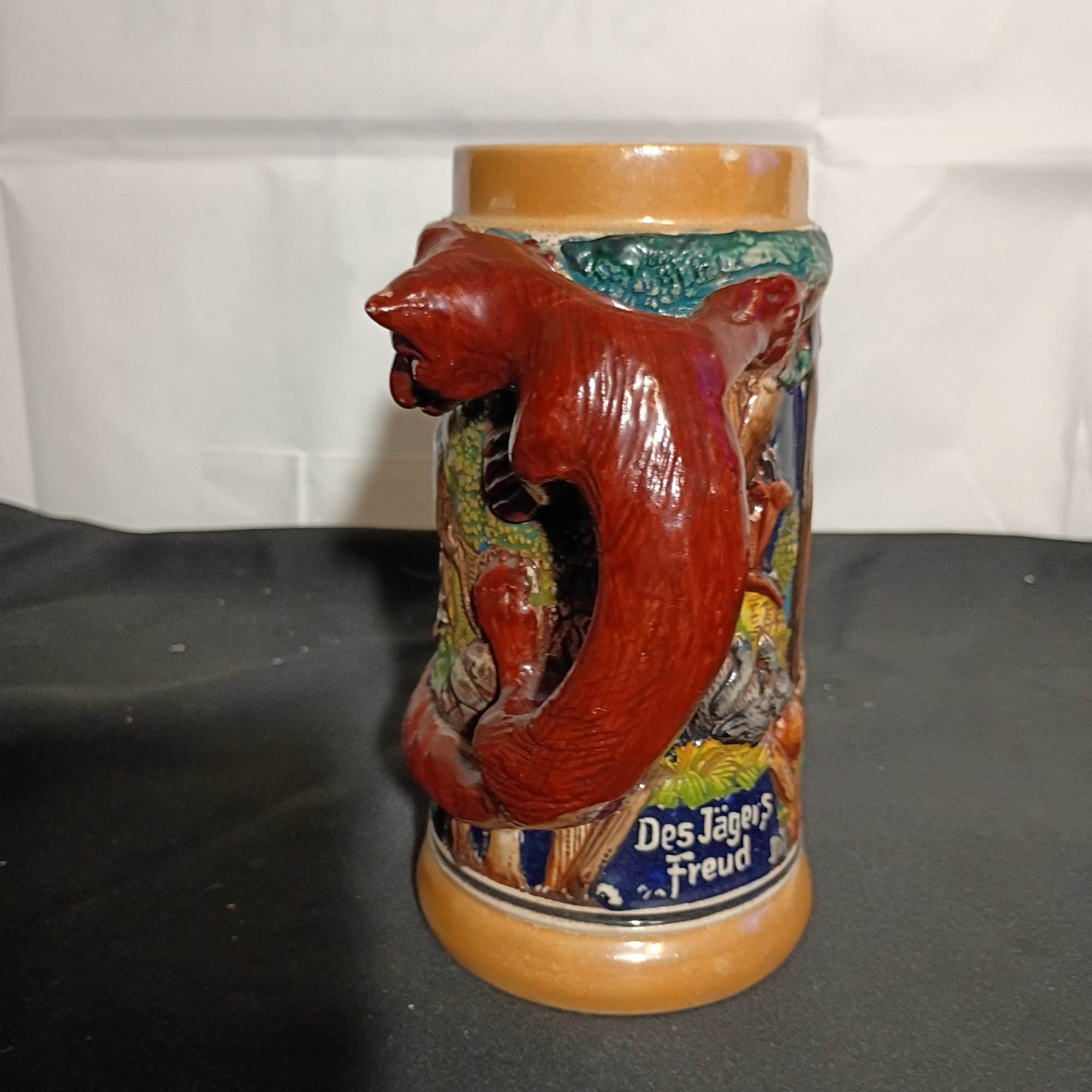 Vintage Ceramic German Beer Stein Featuring A Detailed Hunting Scene With A Fox-shaped Handle (NM)