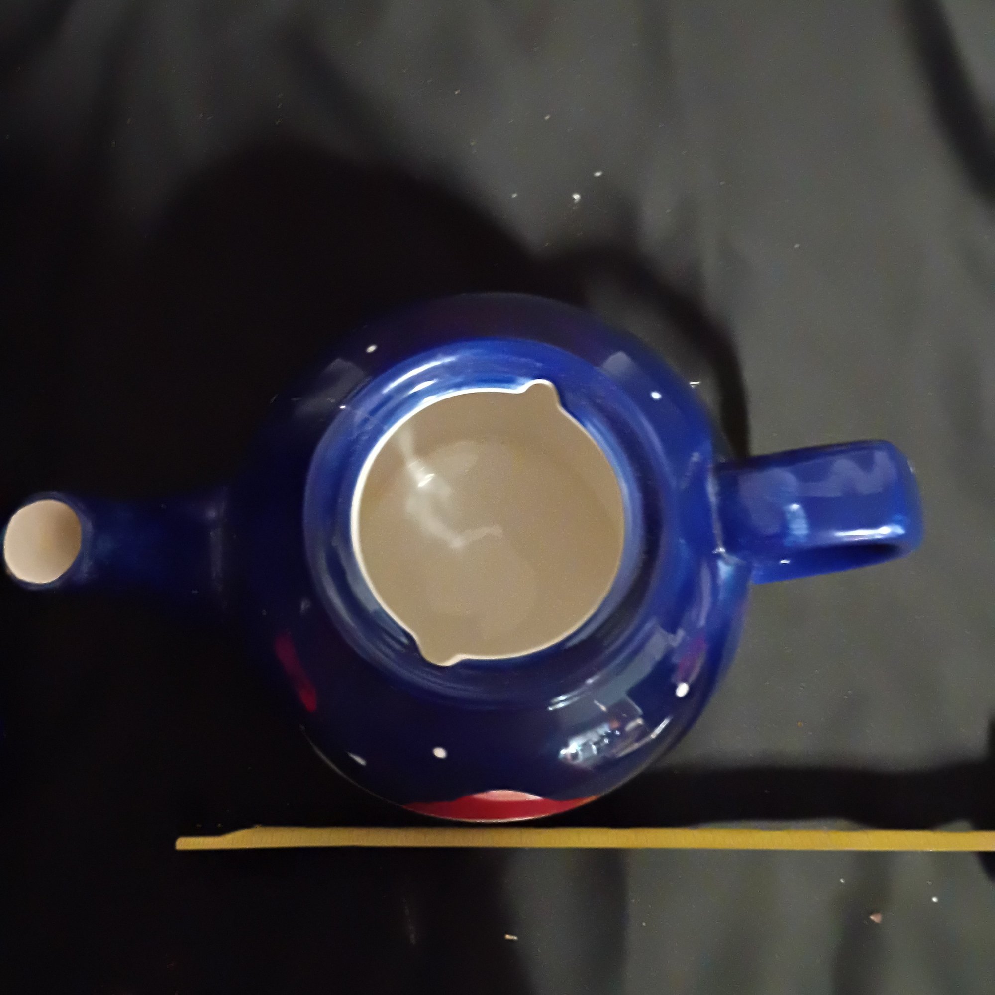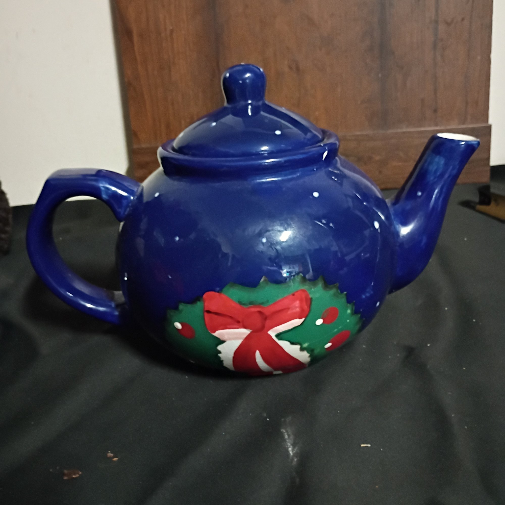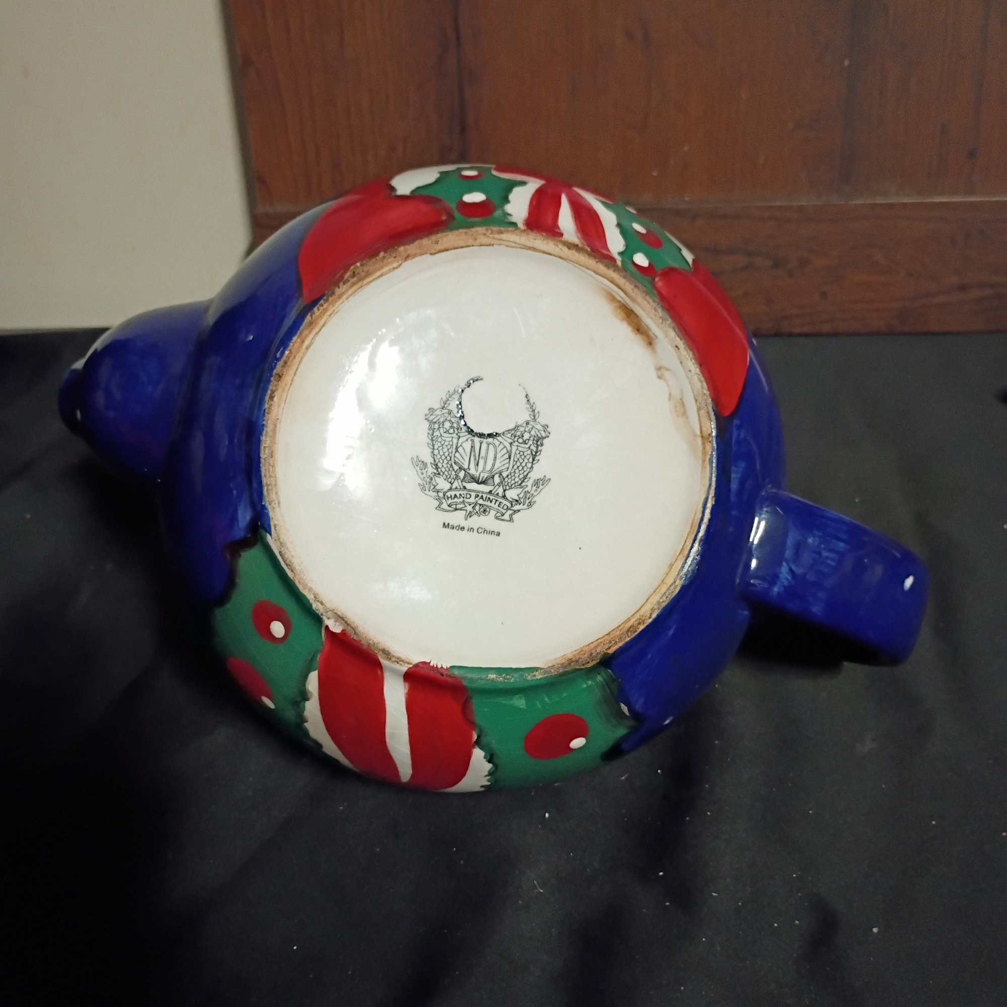 Vintage Ceramic Teapot Features A Hand-painted Snowman Design On A Blue Background (NM)