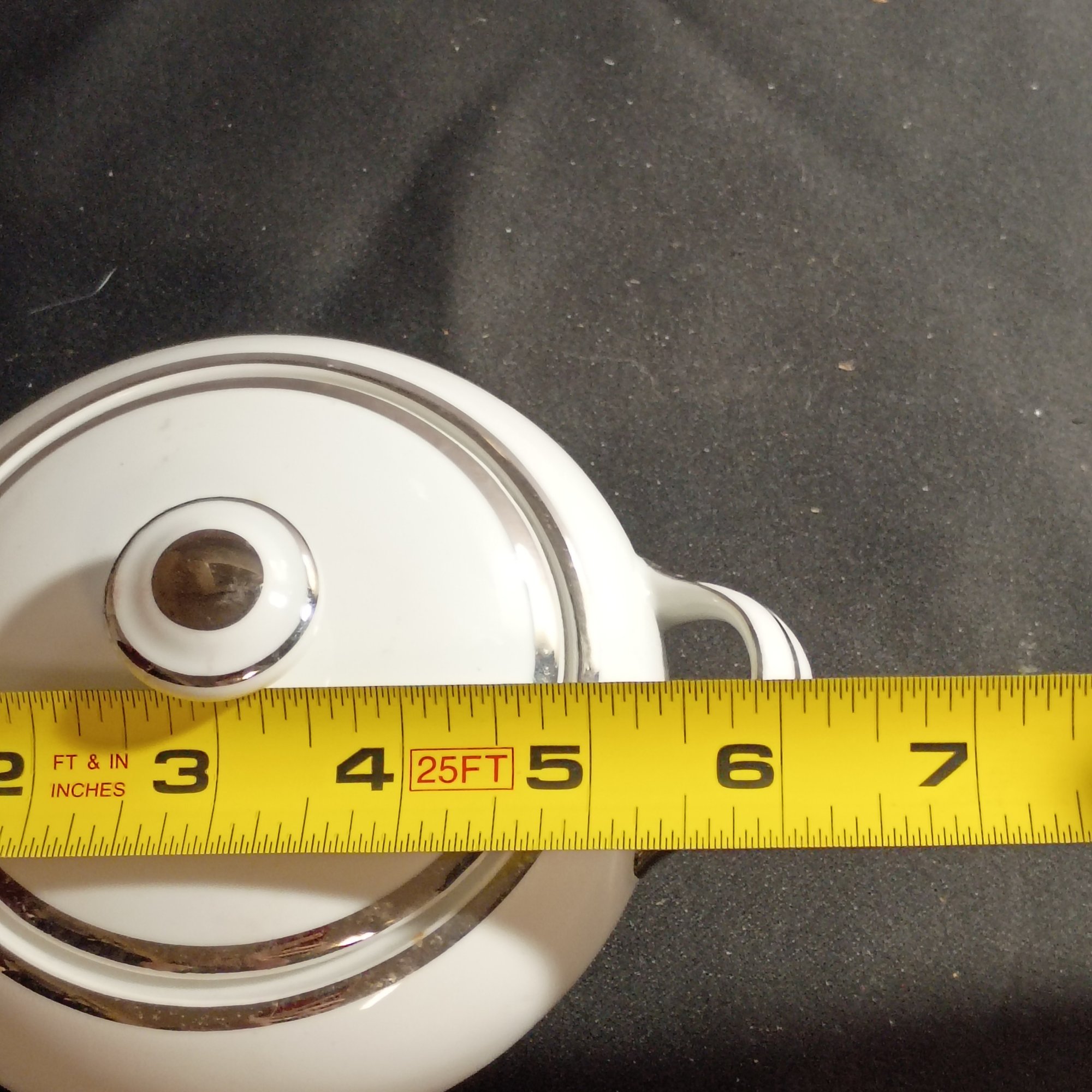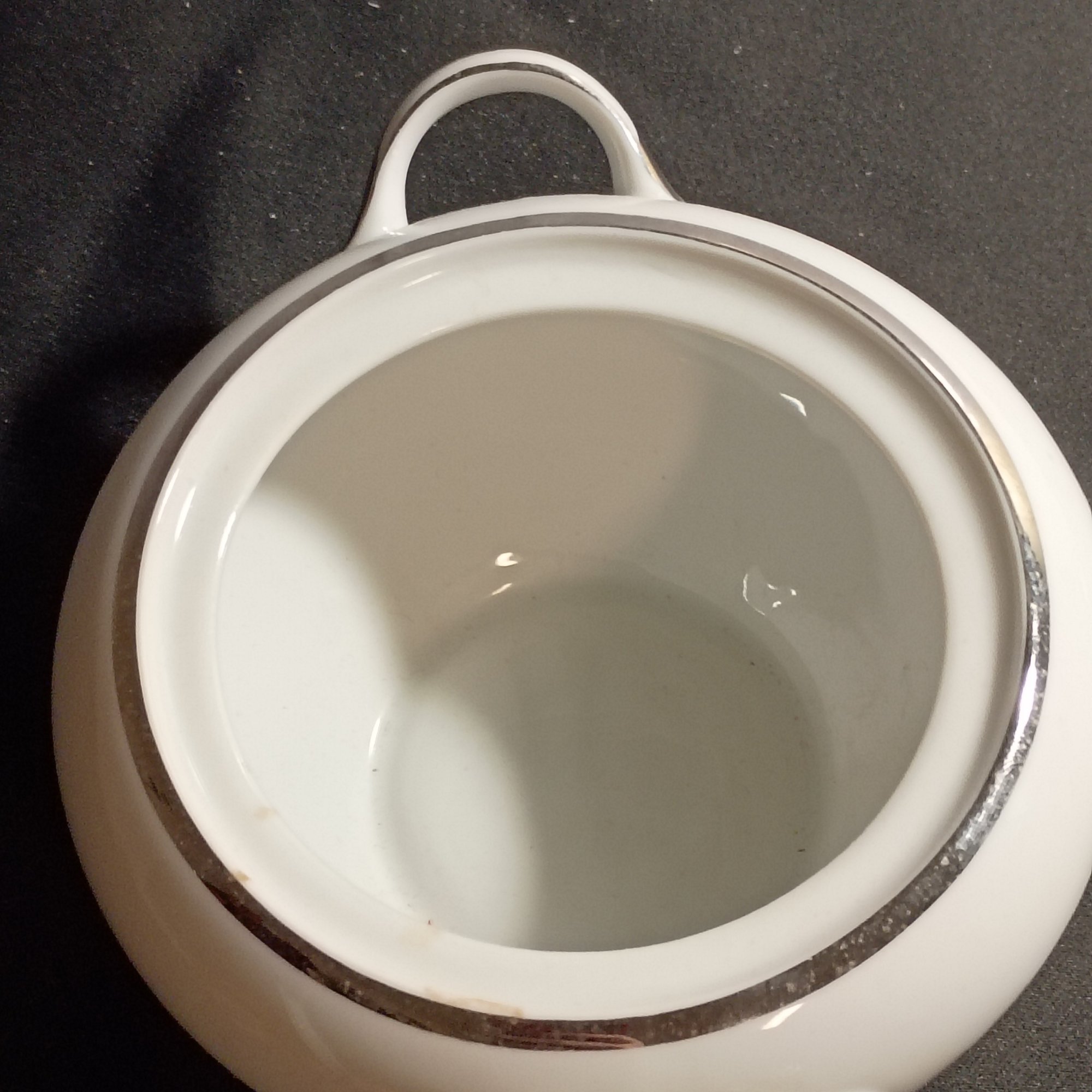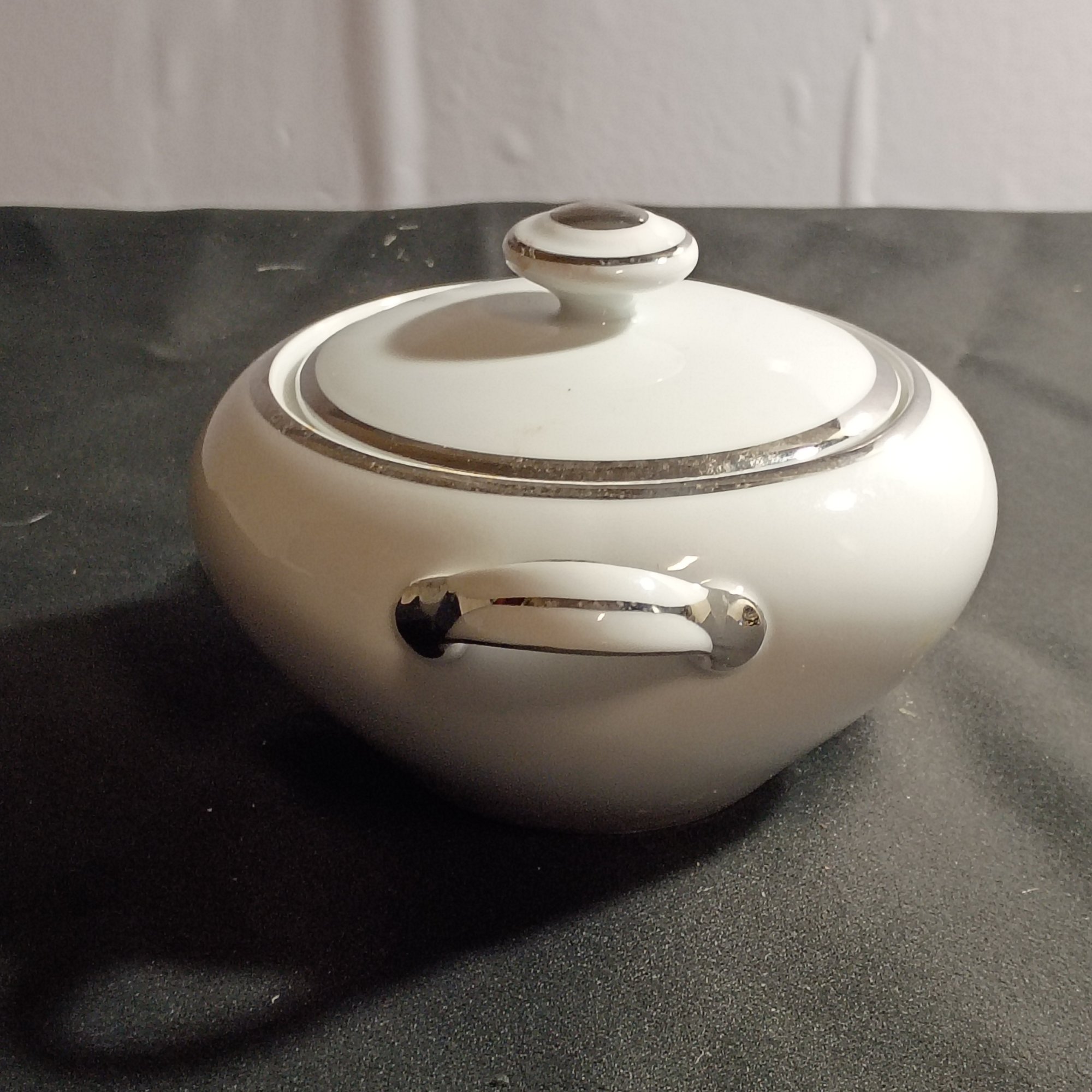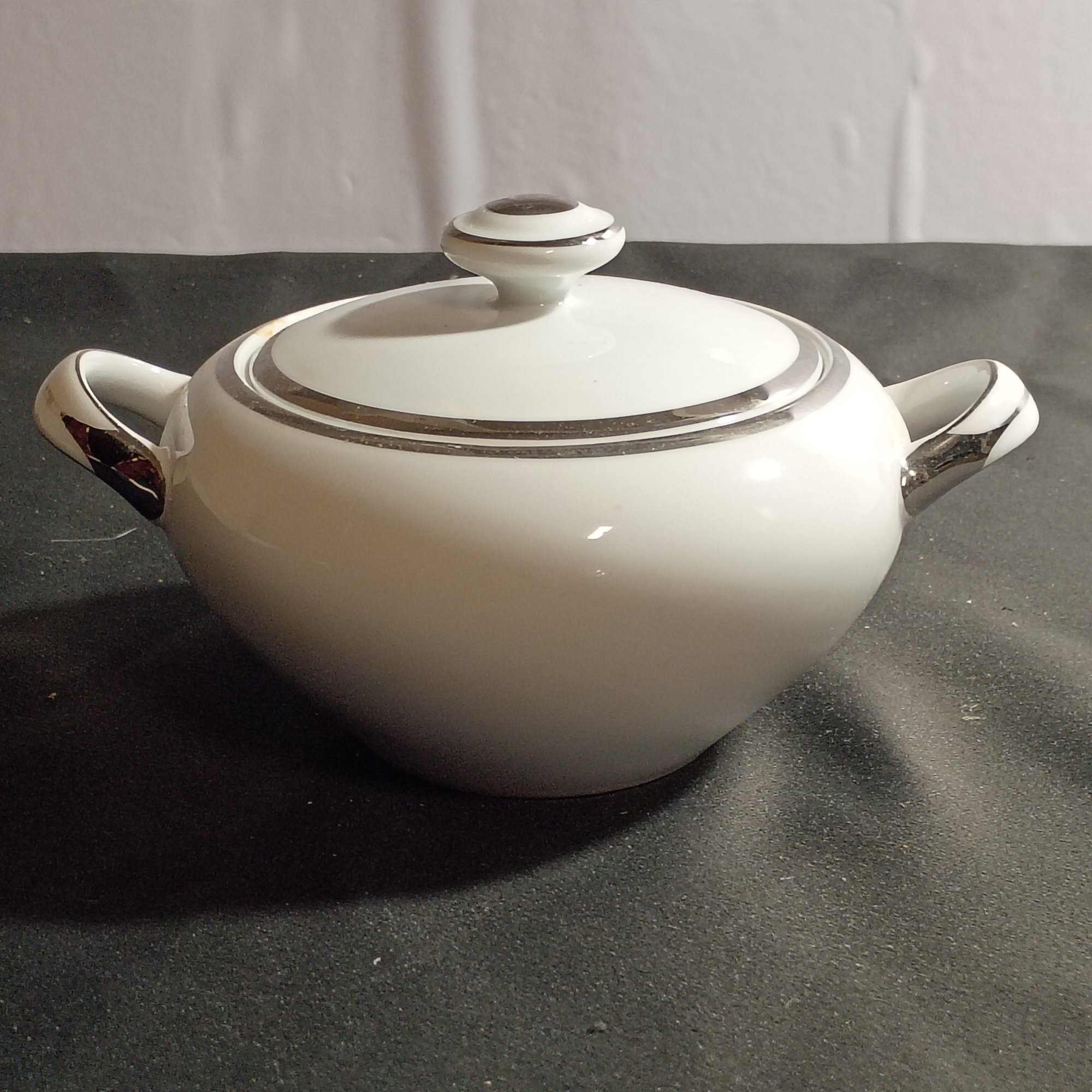 Vintage Covered Sugar Bowl Is The Harmony House Moderne 3545 Pattern, Featuring White China With Platinum (NM)