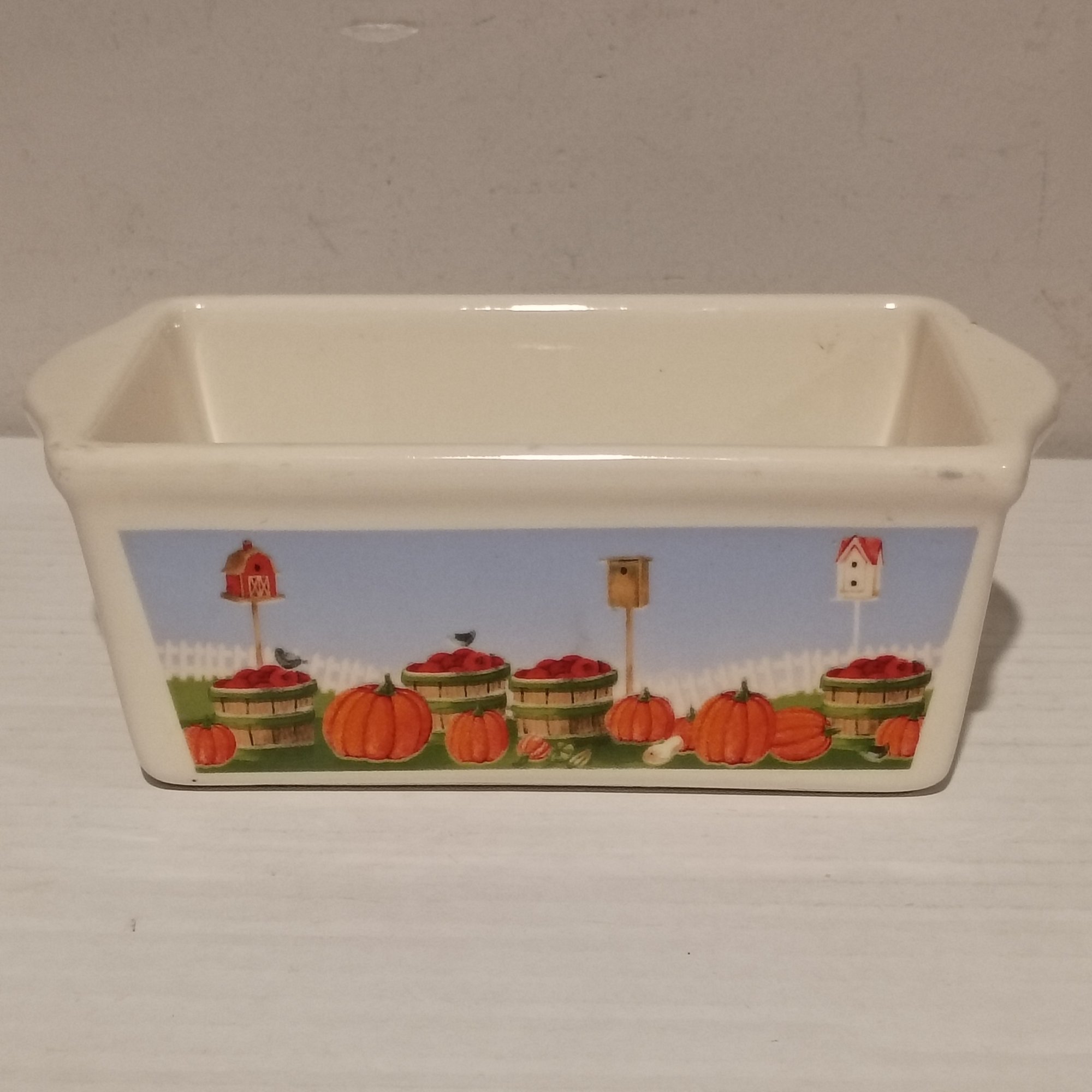 Vintage Nantucket Brand Ceramic Mini Loaf Pan Featuring A Festive Autumn Pumpkin Themed Pattern (NM)