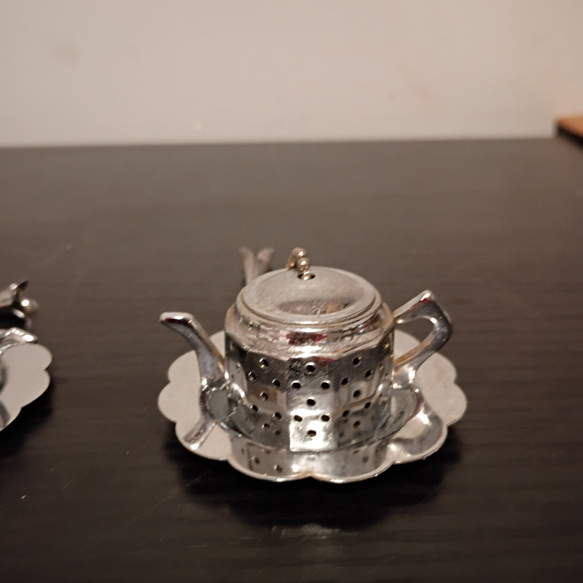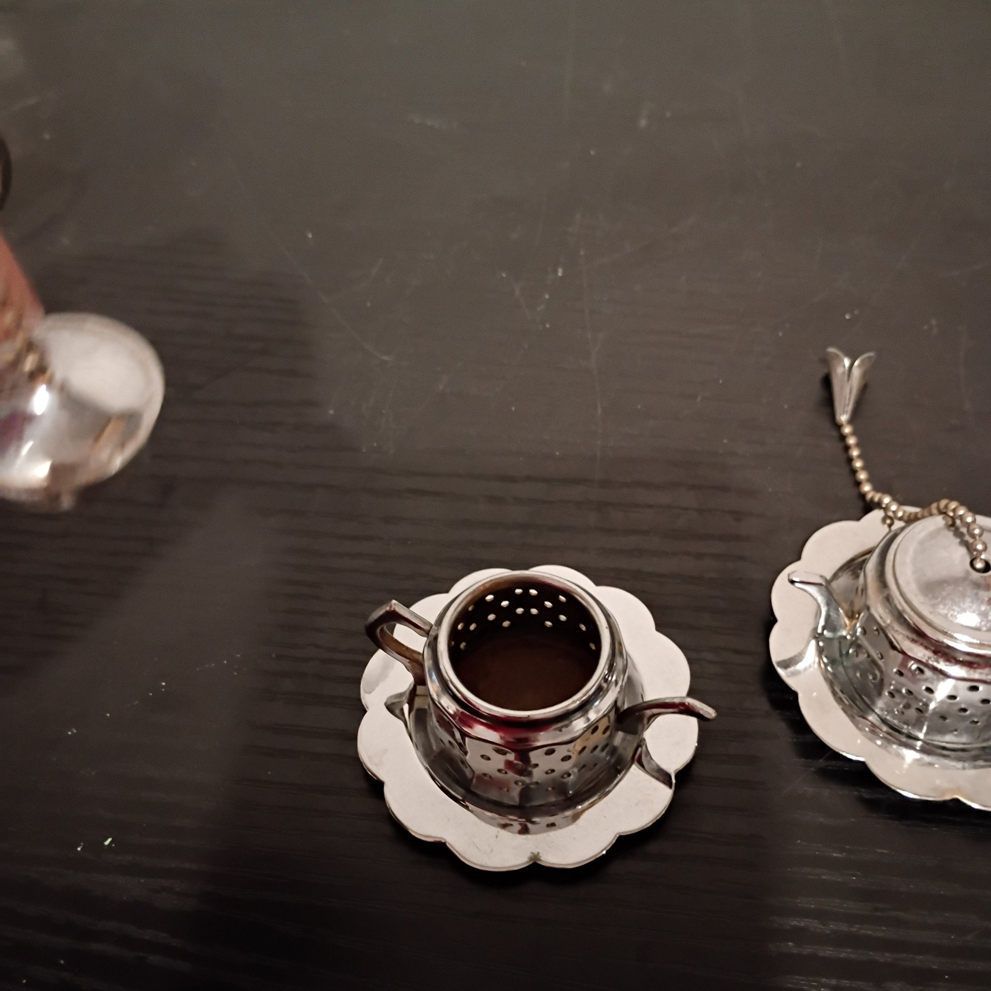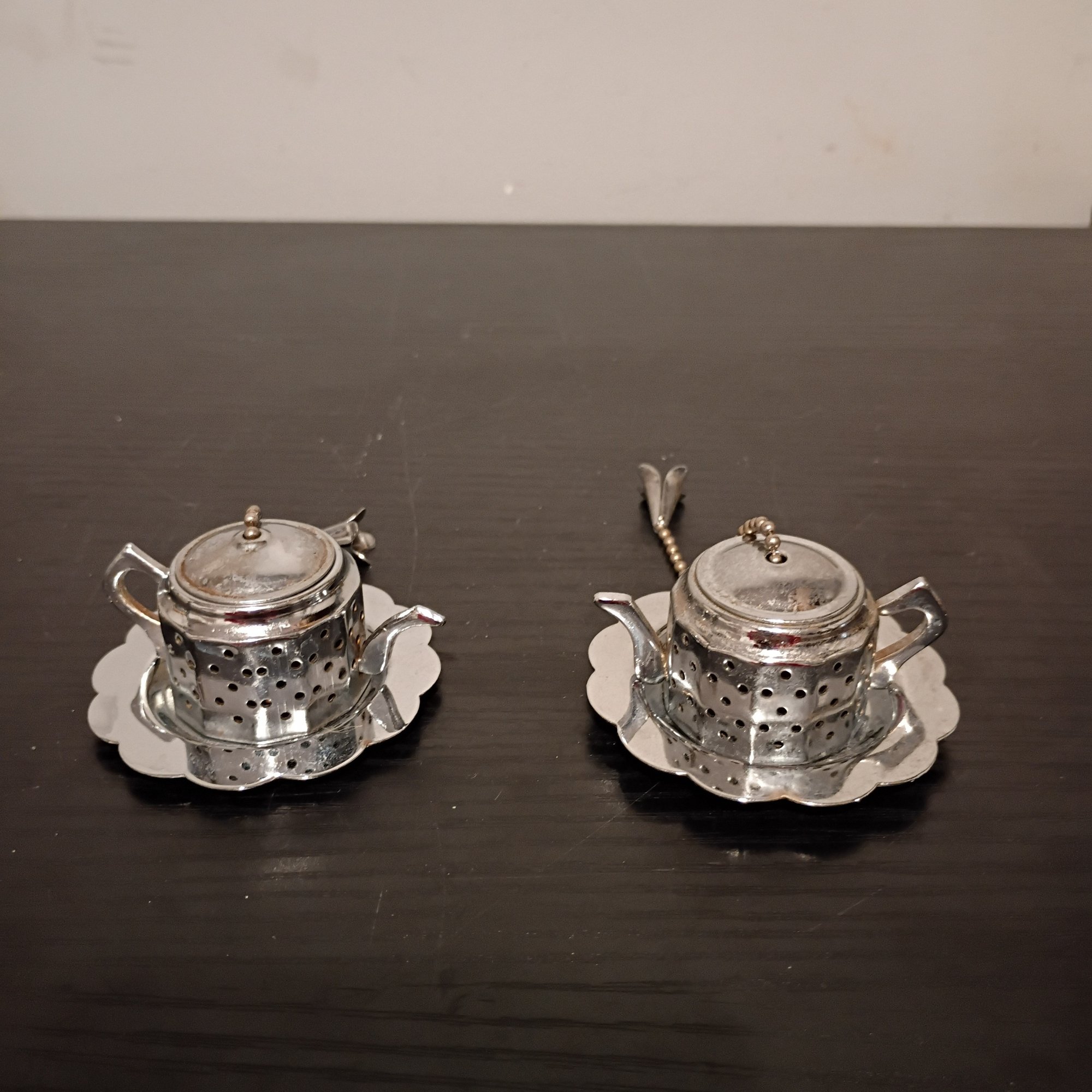 Vintage Teapot-shaped Tea Strainers With Matching Drip Trays