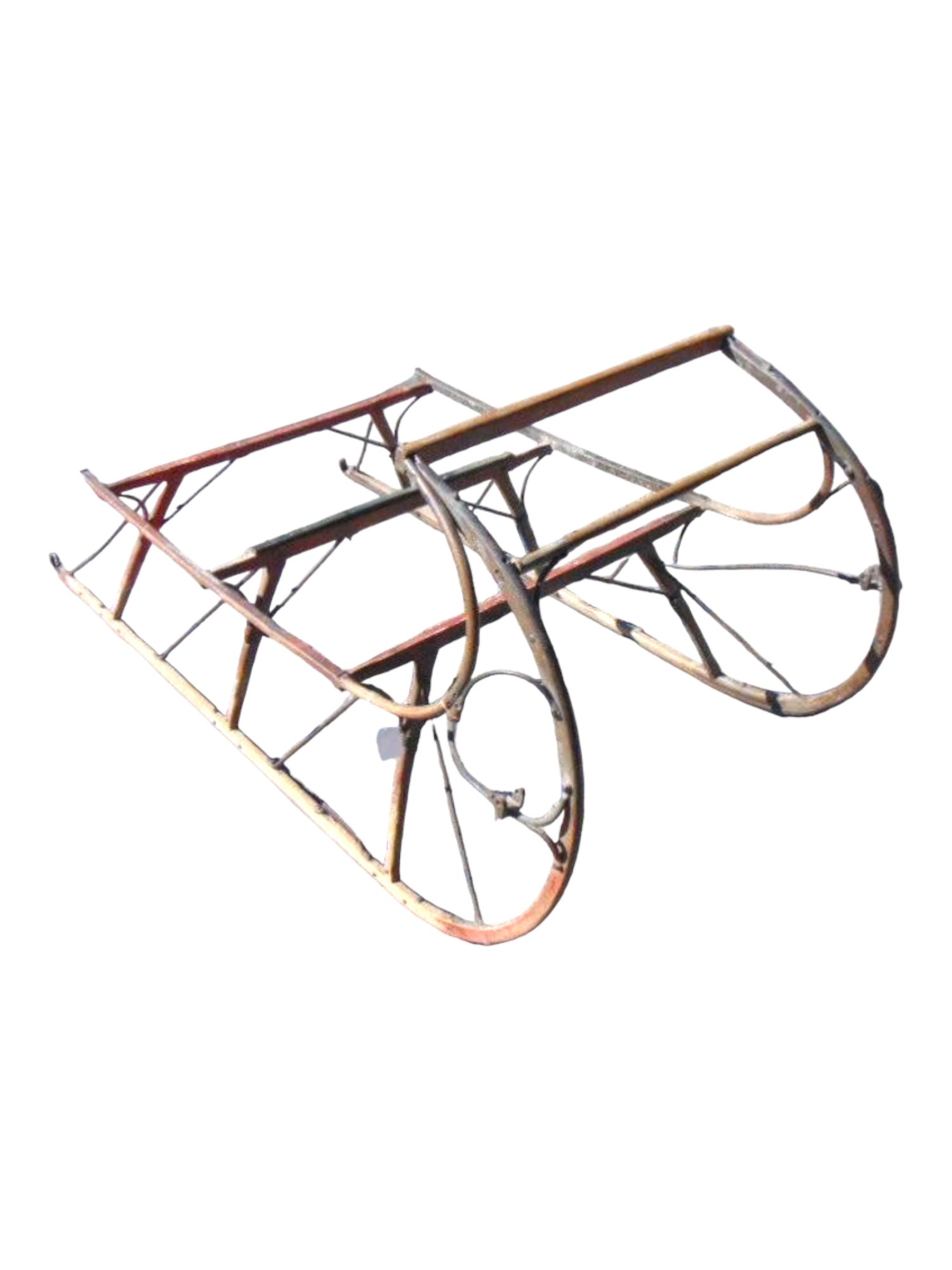 Large sled frame, base structure only, wood & iron, top carriage missing, base is 37" wide, 73" long, height is 33" (at highest point, measured at the front)