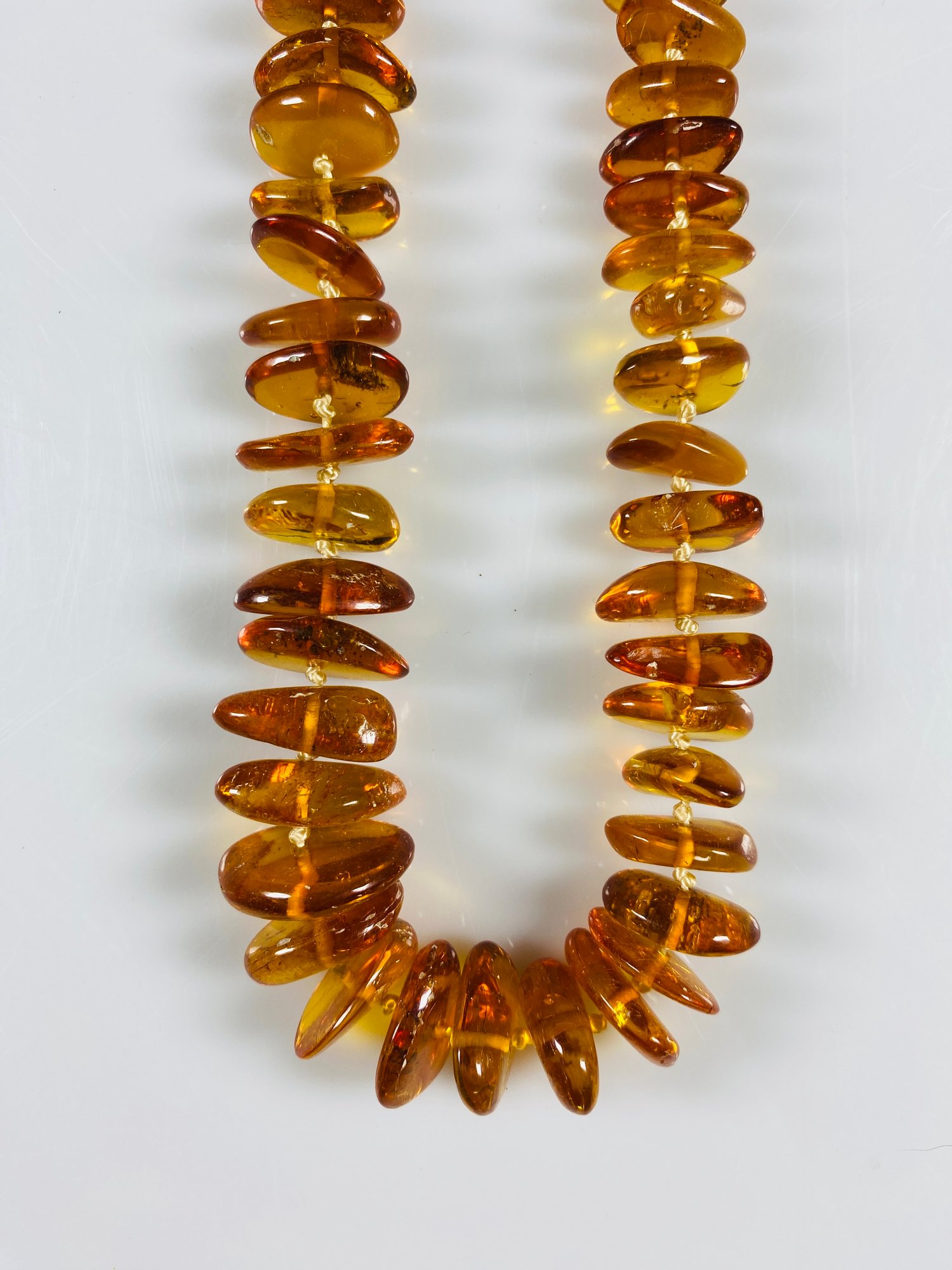 Beautiful necklace of oval disc shaped amber beads. The amber has wonderful color and fire.