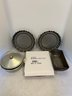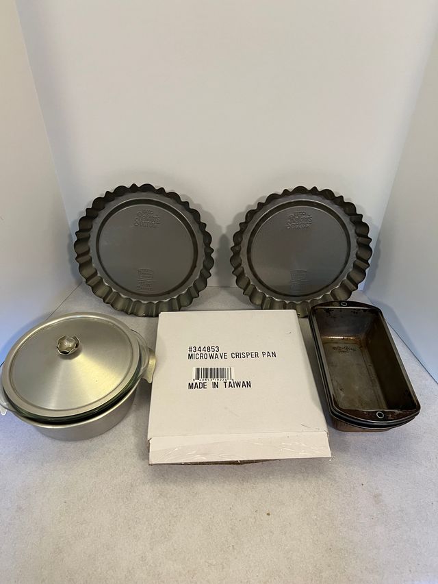 Bakeware including loaf and tart pans and vintage casserole with glass insert.