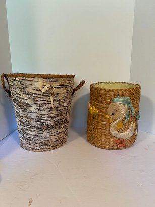 Birch basket and decorated wicker basket. Child step stool that folds up into a seat.