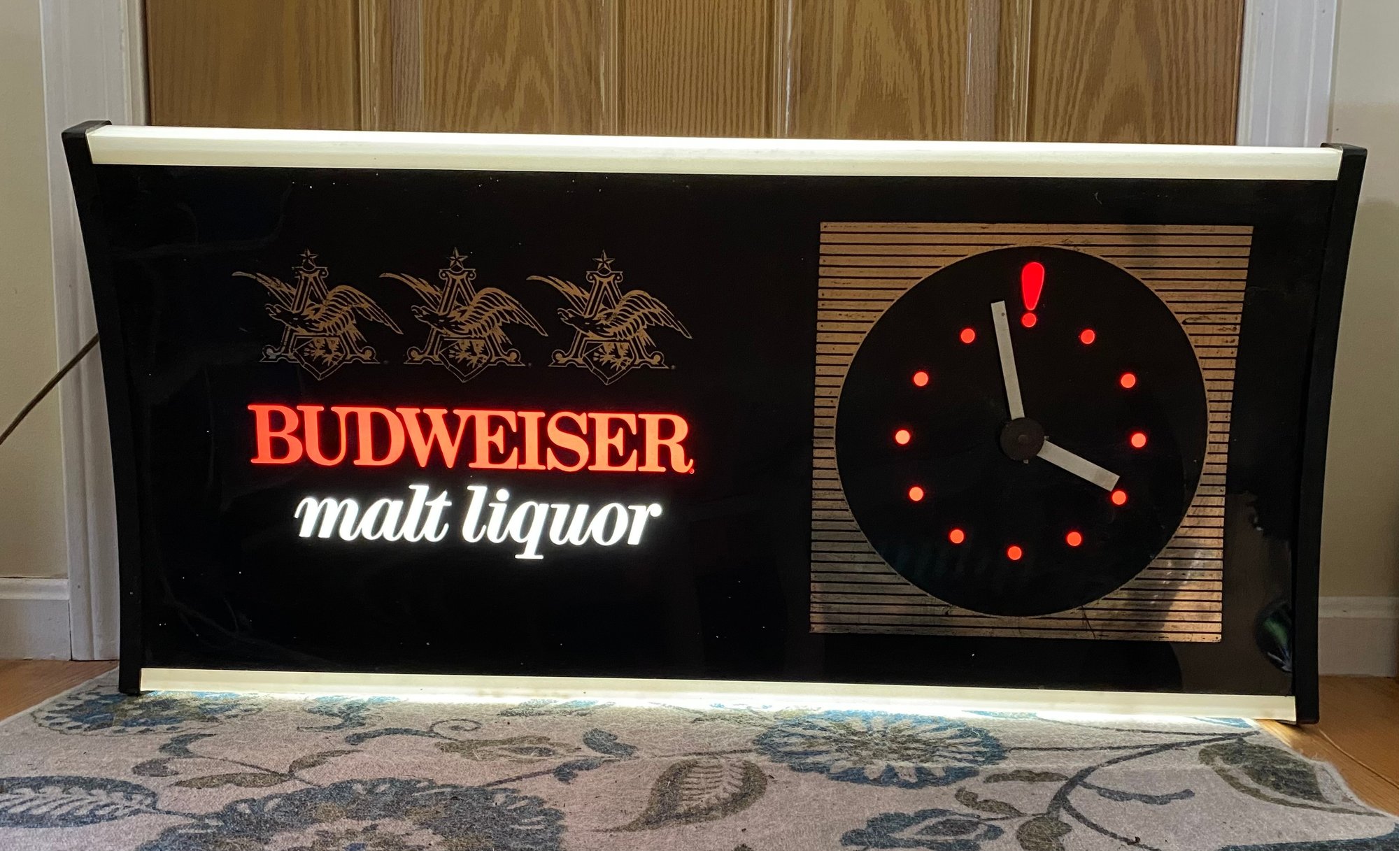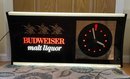 Sign with clock (clock untested). Pull chain, light works. Approximately 35.5" x 16.5".