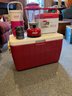 Coleman coolers. Large approximately 23" x 12 1/2" x 15". Small approximately 10" x 7" x 9". Lanterns and beverage cooler.
