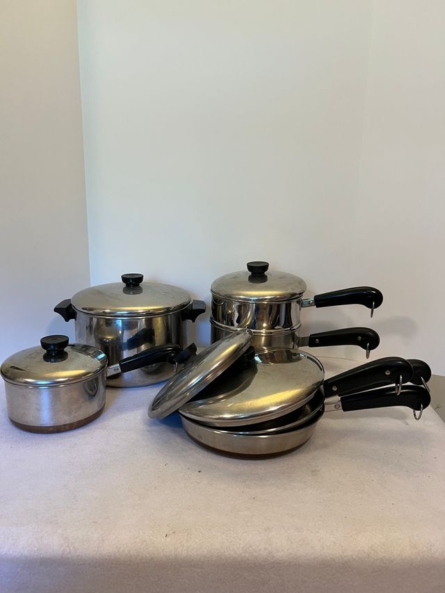 Set of pans, frying pans, and covers.