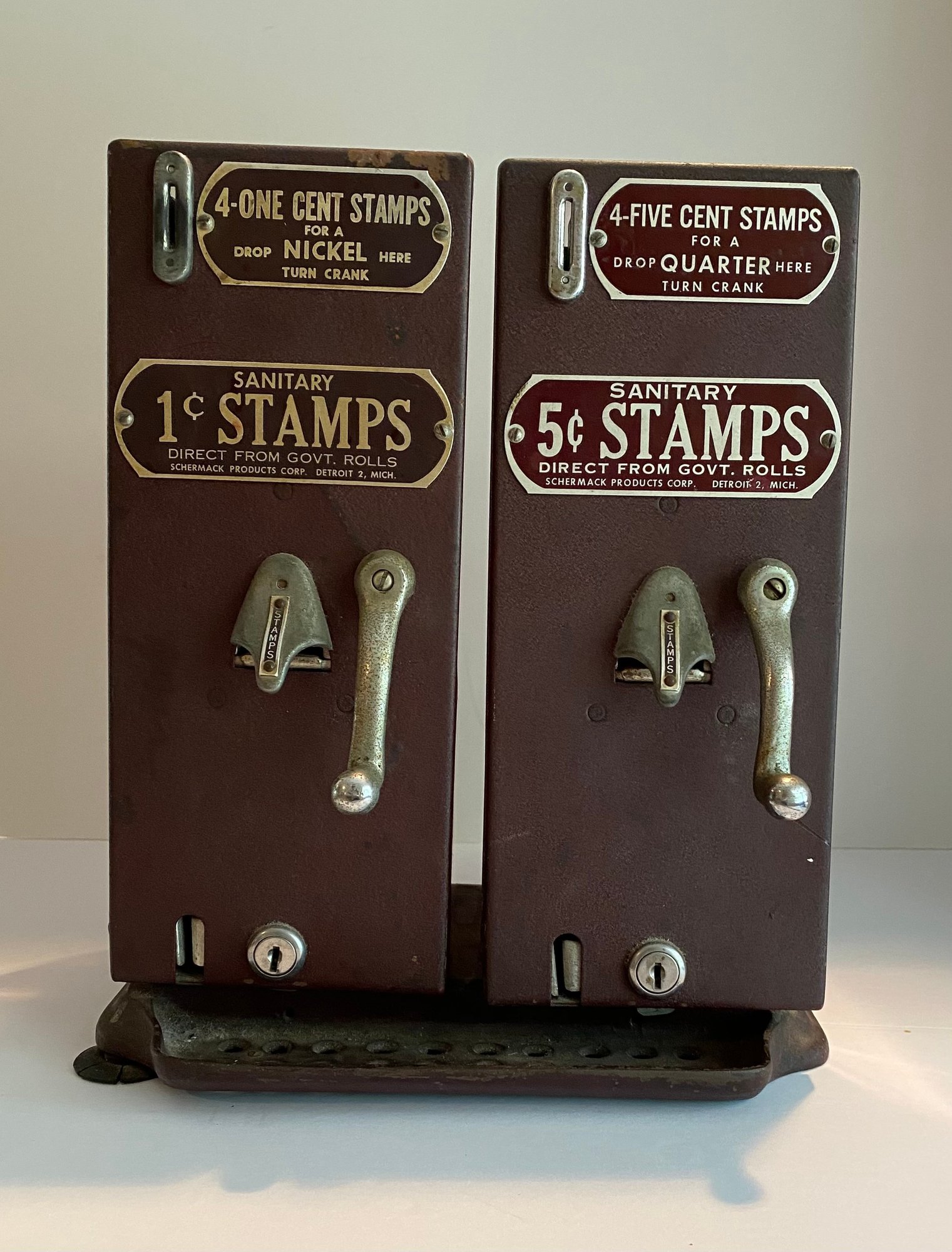 Approximately 13" high, 11.5" across at base, 9" depth front/back at base. Stamp dispensers open but no key. Rubber feet missing on one side of base.