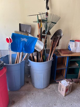 Three Barrels W/ Yard Tools & Snow Shovels. All barrels have covers.