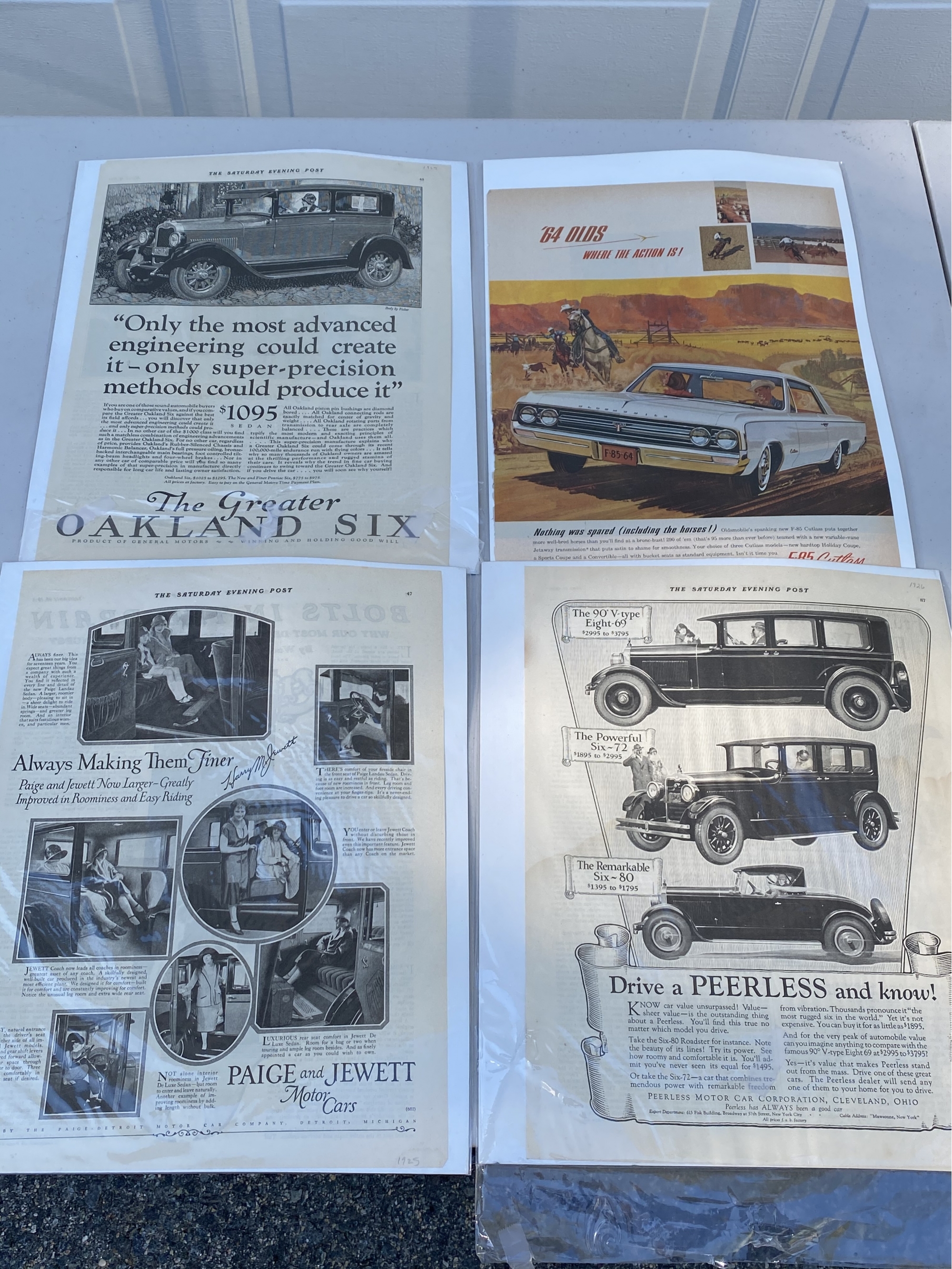 Greater Oakland Six by GM. 64 Olds. Paige and Jewett Motor Cars. Peerless. One is 10 1/2" x 13 1/2", three are 10 1/2" x 14".