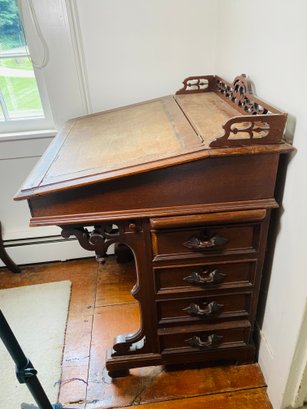 This desk is sturdy but does have significant cosmetic damage. The top decorative piece on the side with the drawers is loose. This piece measures about 28" wide, 26" deep and 36" tall.