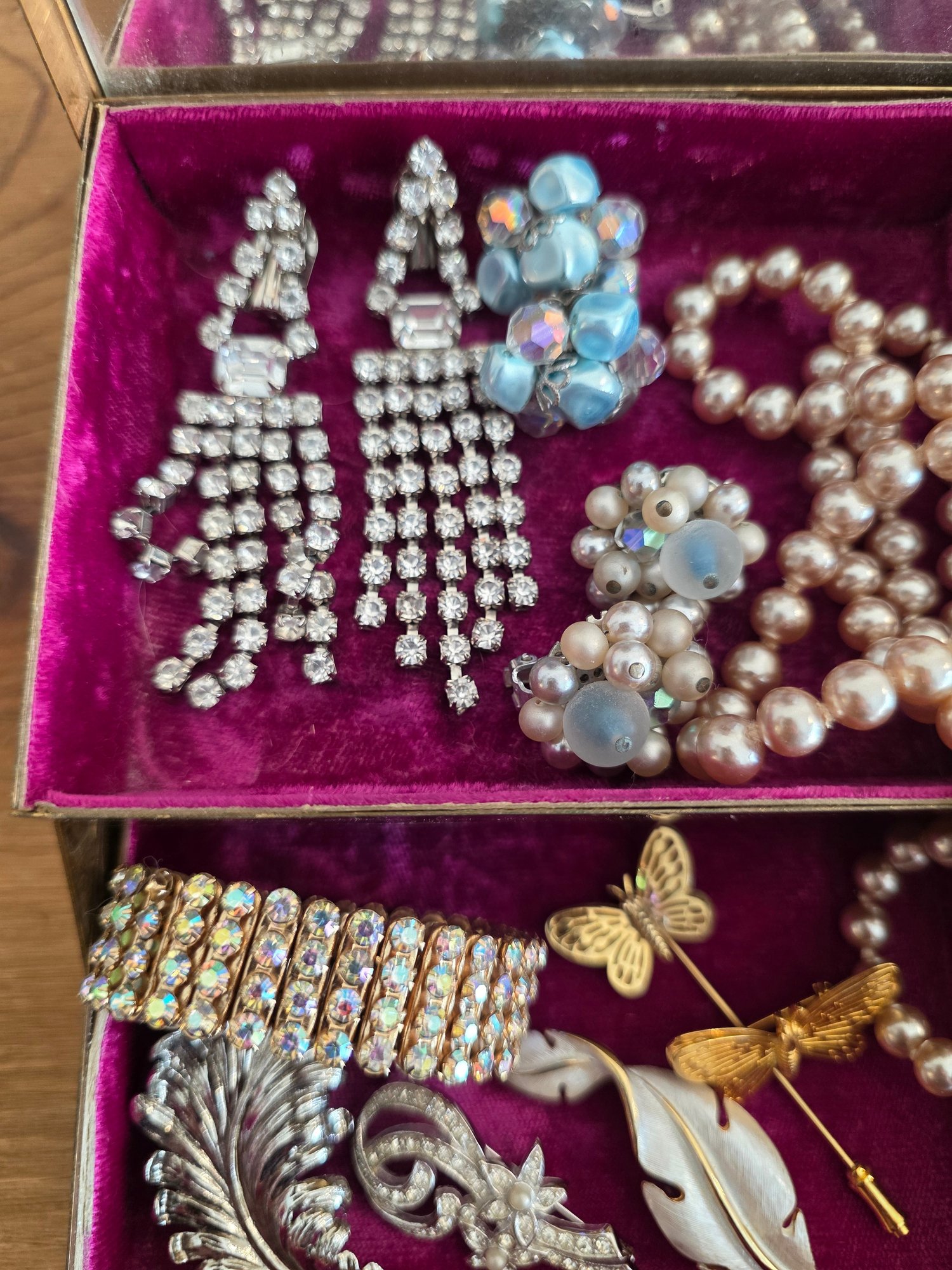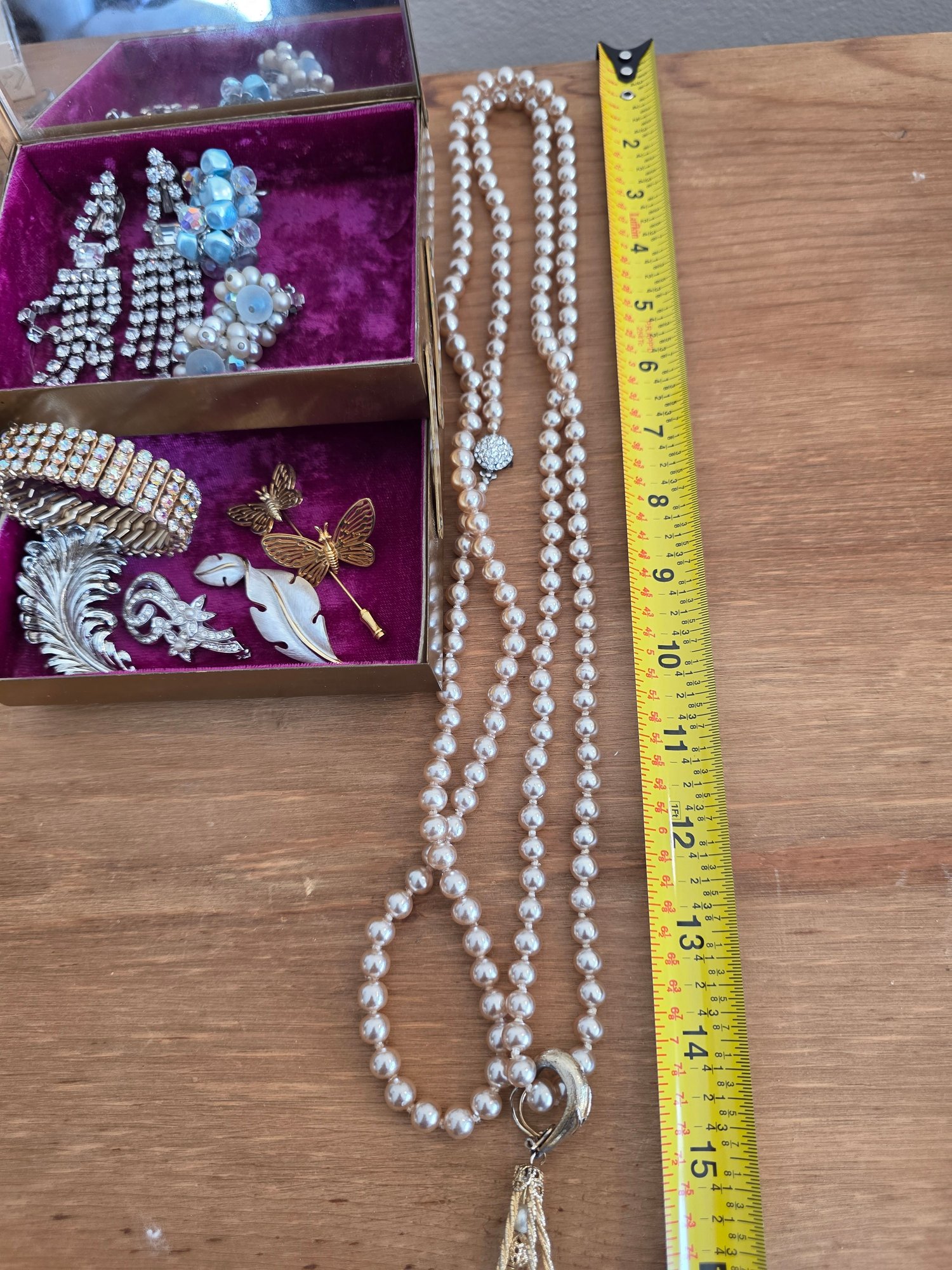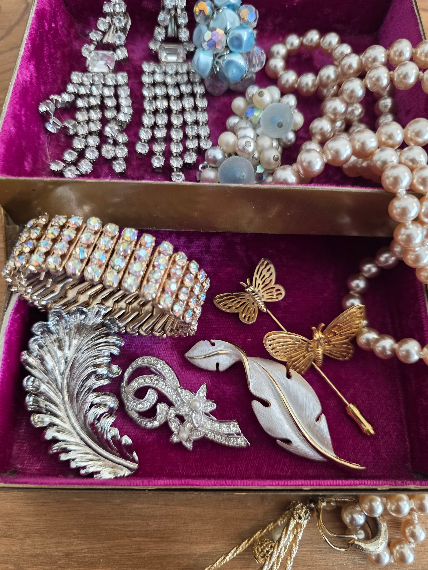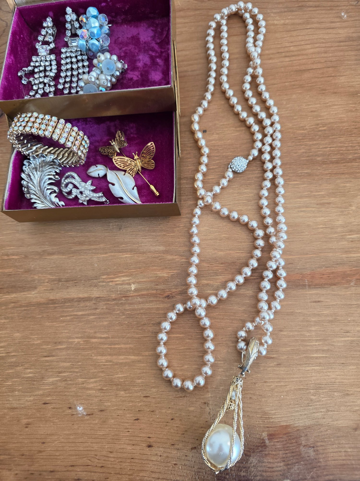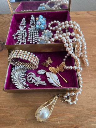 Includes: 3 Pairs Earrings, 1 Faux Pearl Necklace with Detachable Pendant, 4 Brooches, 1 Stickpin, and 1 Aurora Rhinestone Stretch Bracelet
