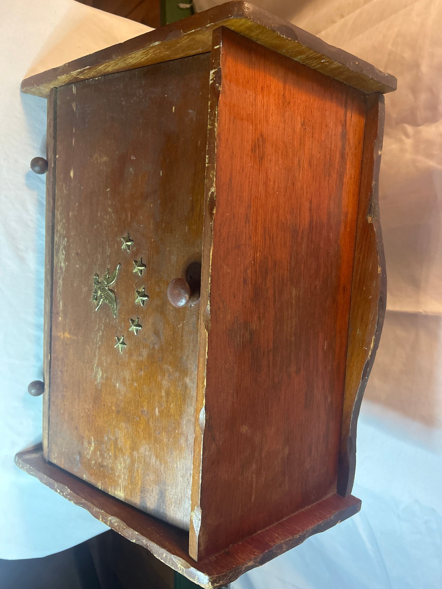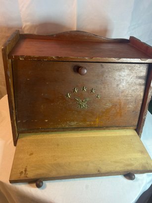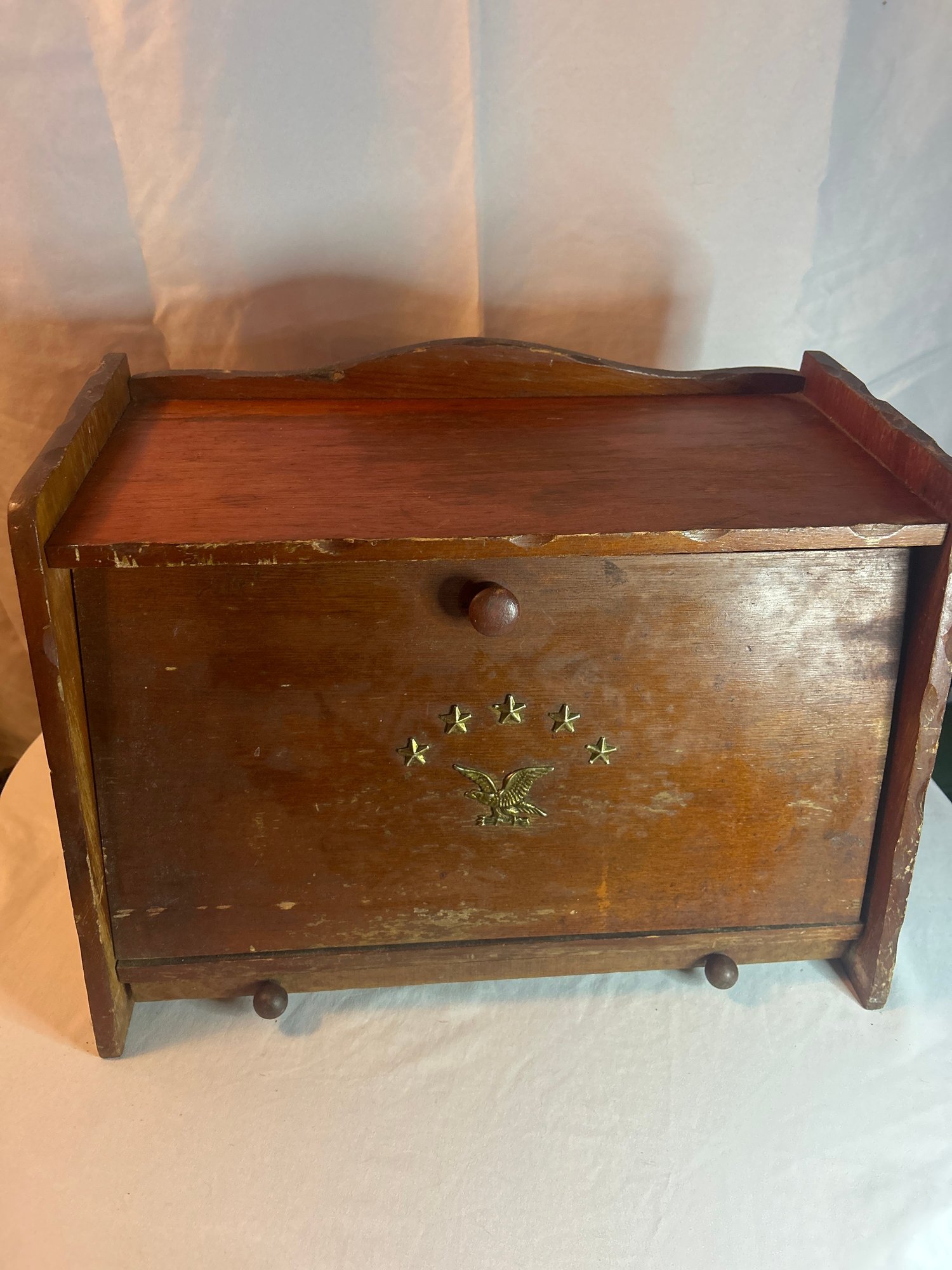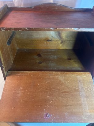 Lot 10: Antique Americana Wooden Bread Box With Built In Cutting Board approx 17.5 inches long by 9.5 inches deep by 12 inches tall sold as is