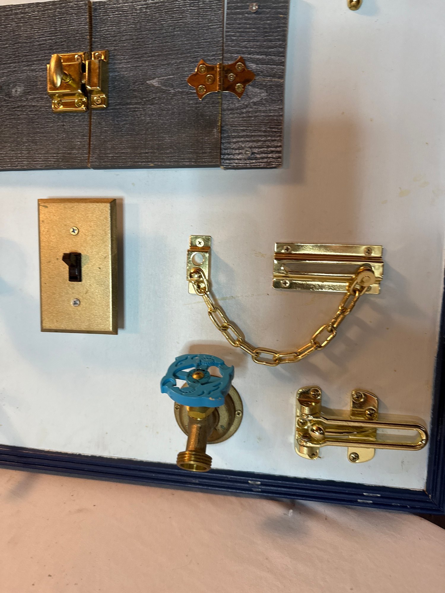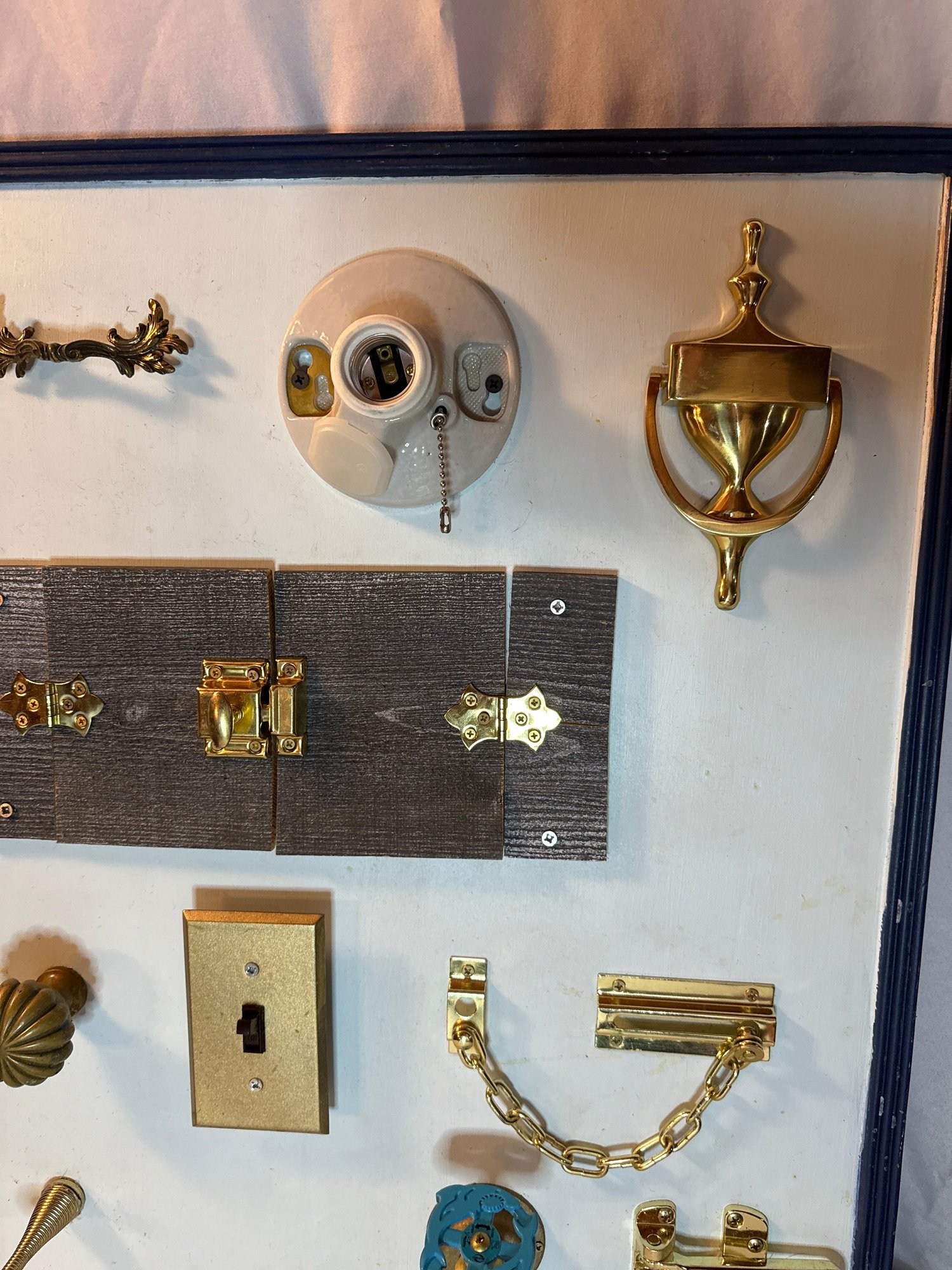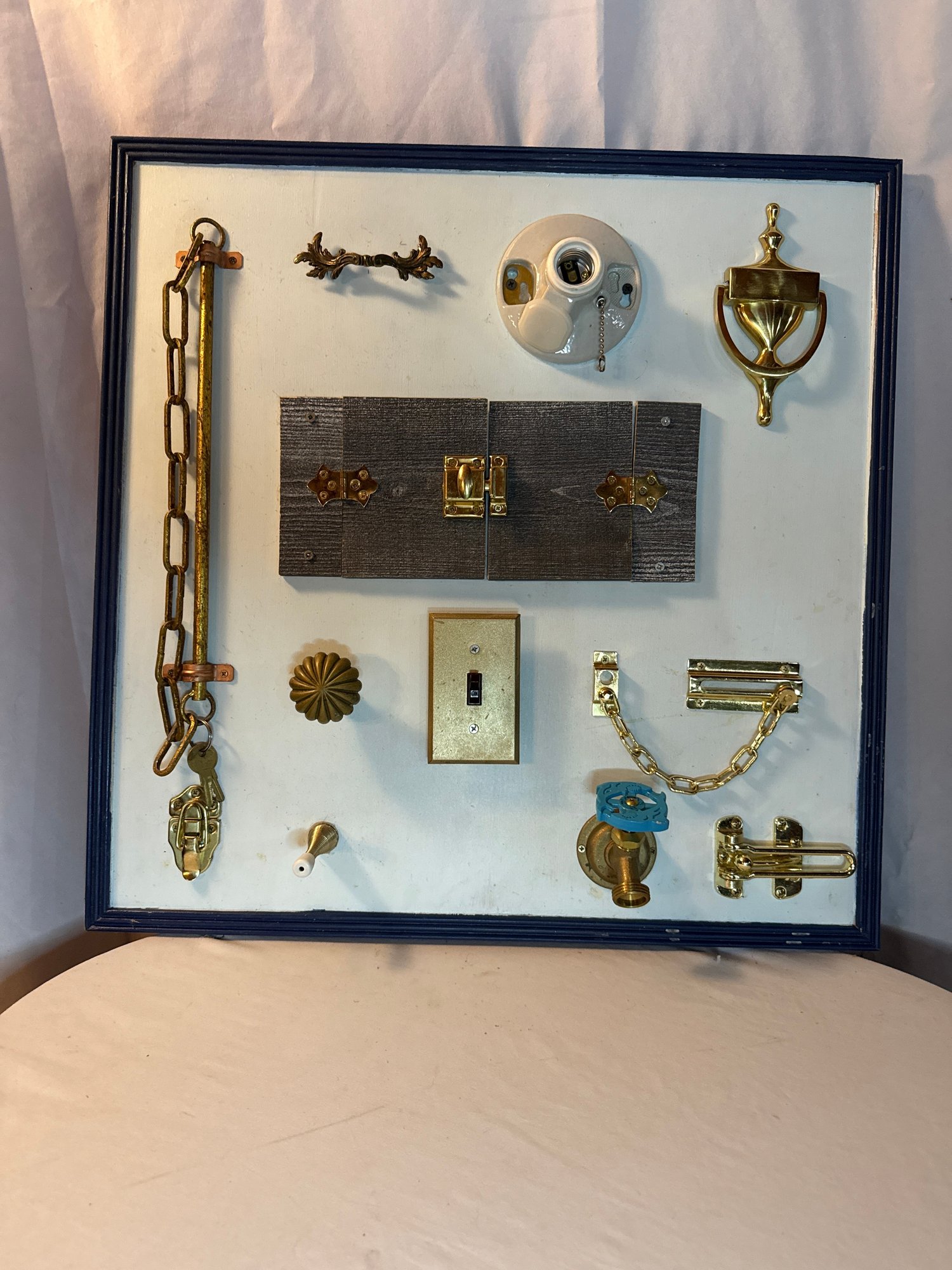 Lot #43: Homemade Montessori-Style Busy Board (Or Folk Art?). 24”x24”. Sold as is.