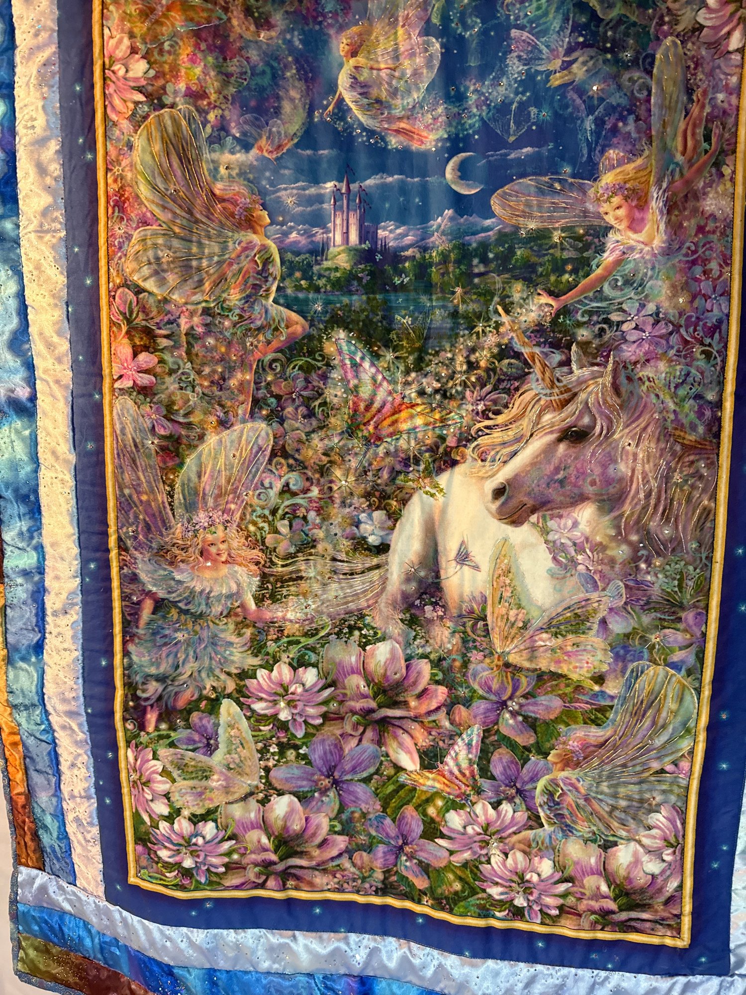 Lot #44: Handmade Beaded Unicorn and Fairy Tapestry. 48”x31”. Has rod a lot for hanging. Sold as is.