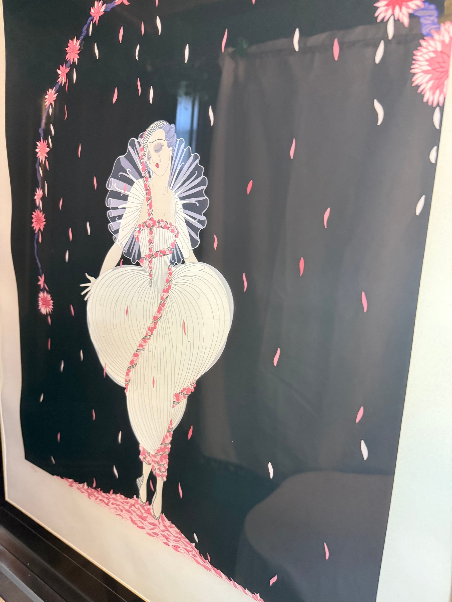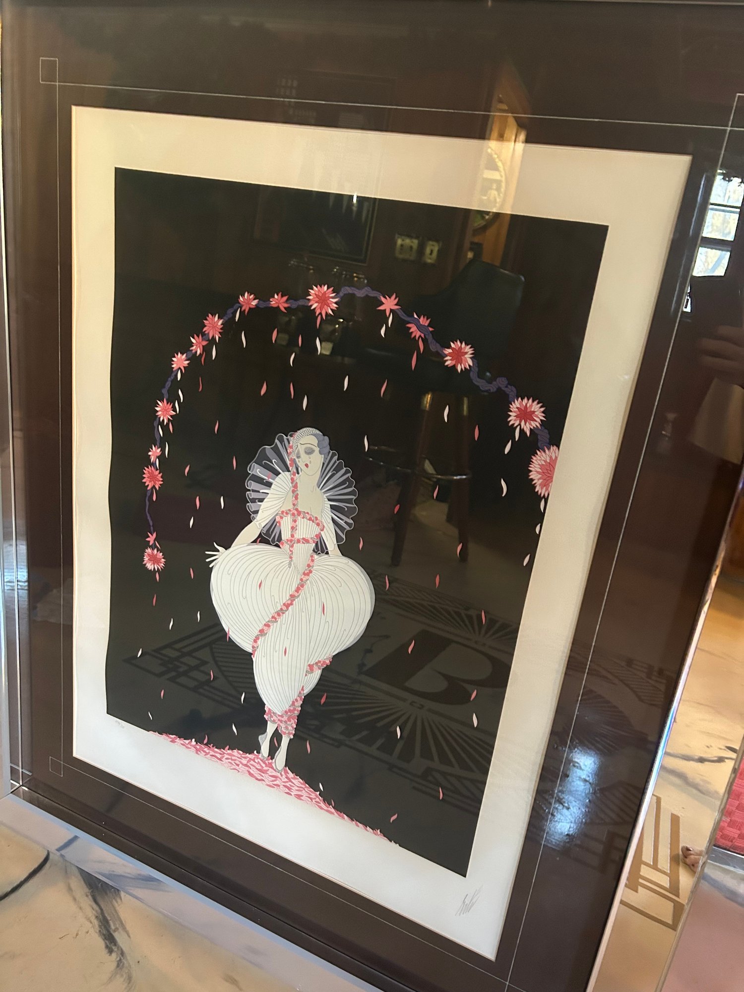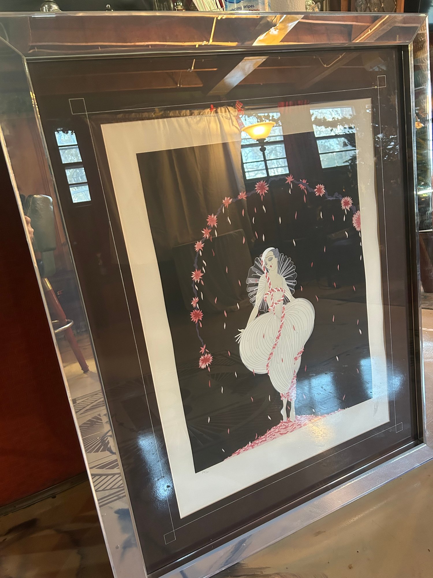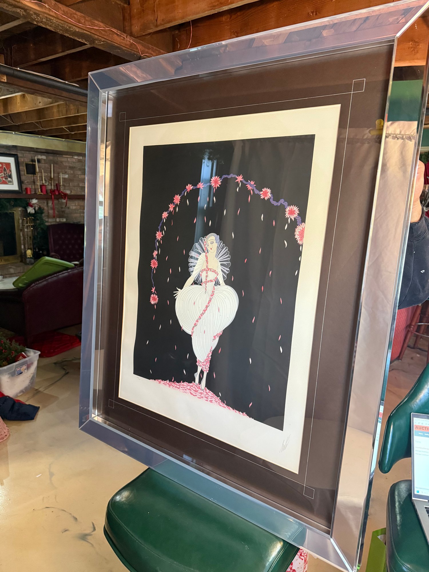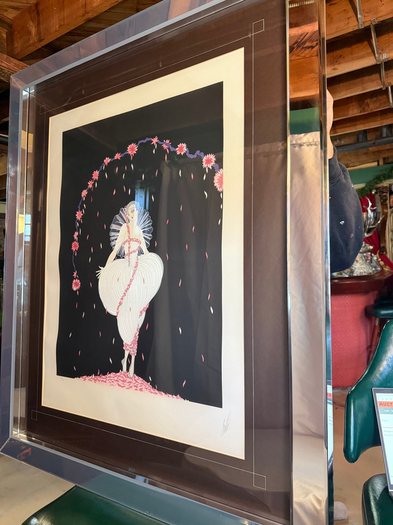 Lot #48: Beautiful “Columbine” limited edition serigraph. Captures the iconic beauty of Erte’s art. 36ʺW × 1.5ʺD × 44ʺH. Pictures don’t do it justice because of the mirrored frame, which really makes the piece stand out in person. Sold as is.