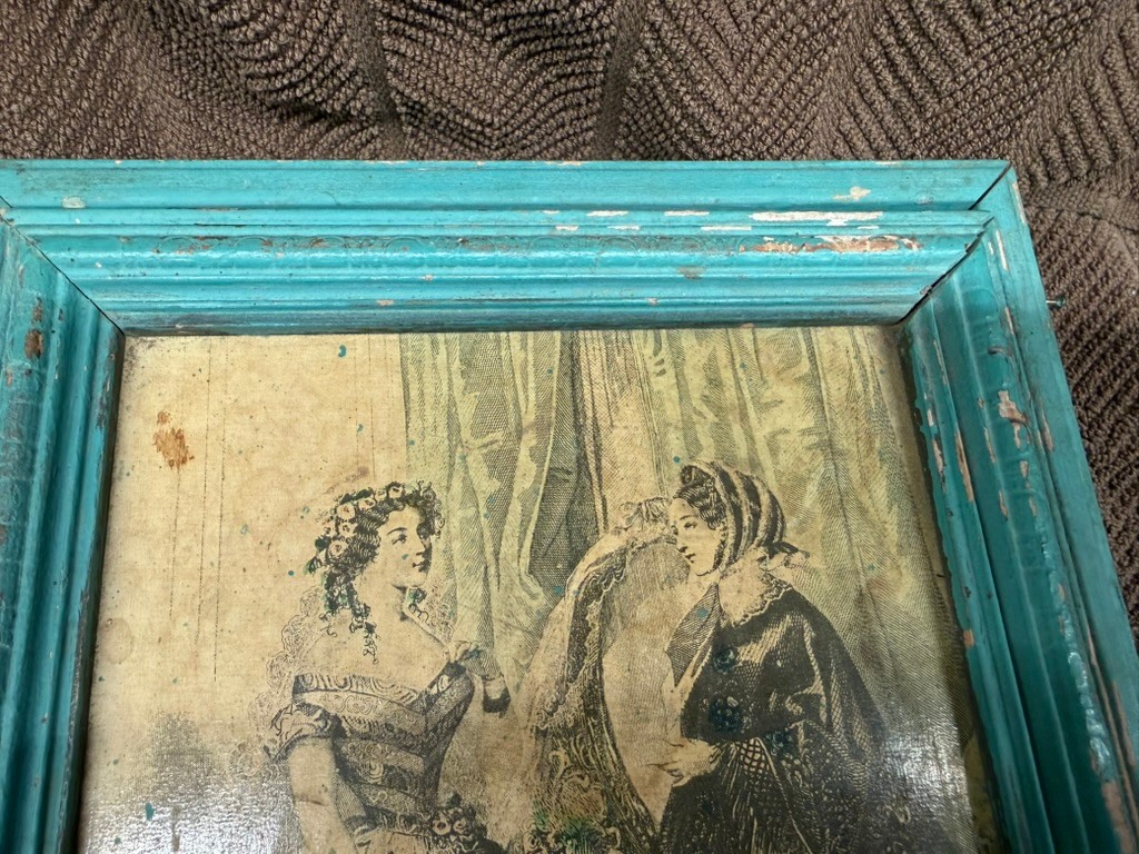 What a cool and original piece! This turquoise painted wooden box features a picture from Jules David. It was hand colored and features victorian fashion. When open there is a mirror inside. Please note- Although this is super cool, there is a decent amount of wear. The top part falls in- see pics. There is also stains, scratches, chipped paint, and small hole inside in the back corner. It does not go all the way through. Please make sure to look at pics closely!