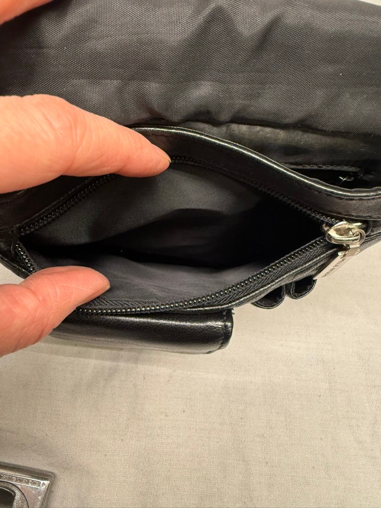 The perfect crossbody purse to easily cary anywhere and keep necessities organized! Very well made black genuine leather with silver hardware. It features easy to access double sided pockets, 1 outer back zip pocket, 1 phone pocket, 2 pen pockets, 2 inner zip pockets, snap close on front and back, 5 card pockets, 1 license pocket, 1 inner zip pocket, 1 open pocket on back side, and a handle to carry from, or easily hang. Please note- This is pre-owned but in overall great shape. There is minor wear on the top of the corners. Aside from that it's in great shape. Please make sure to look at pics closley!