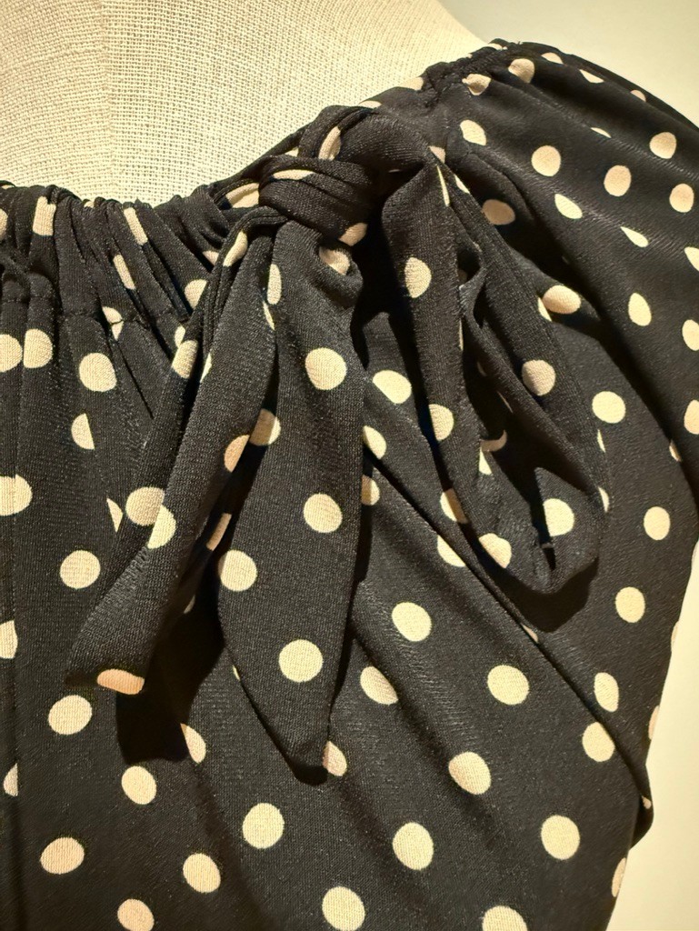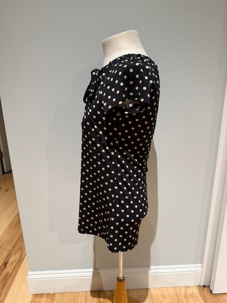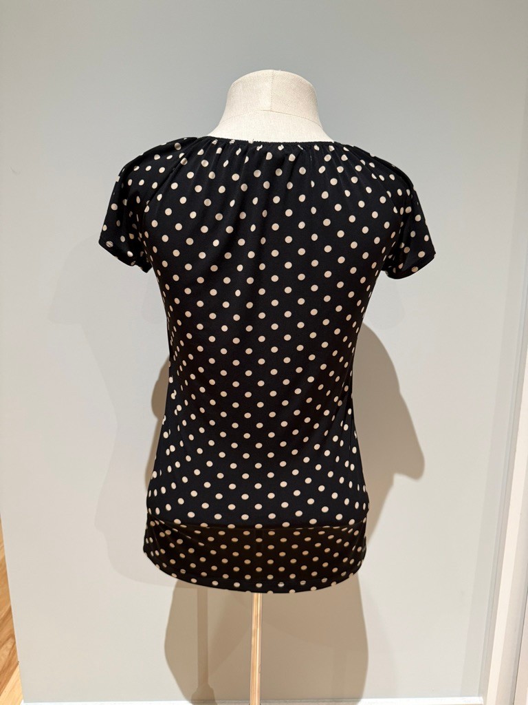 Add a playful touch to your wardrobe with this Liz McCoy Small Black White Polkadot Blouse. The blouse features a round neckline, short sleeves, and a casual sleeve type. It also has a a relaxed fit, making it perfect for travel, casual outings, or business meetings.