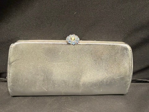 Silver shiny unbranded clutch with sparkly blue button closure. This is a pretty clutch however there is some wear to it. There are some scratches as well as some stains. Please make sure to look at pics closely!