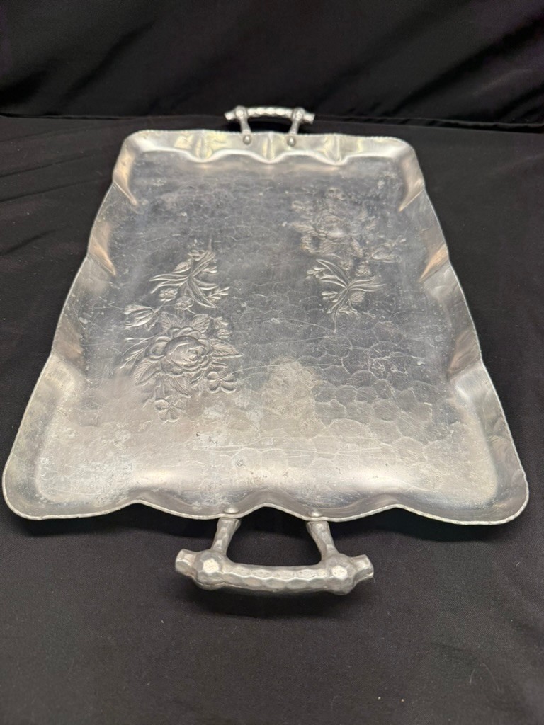 Vintage aluminum rectangular hammered tray/platter with roses, scalloped edges, and handles. Great for breakfast in bed!