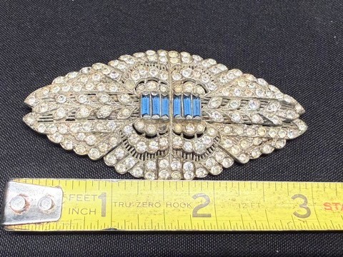 Vintage art decco brooch stones and metal unknown. This was found in an old jewelry box with no other info. There are some missing stones. My best guess is he blue stones are glass (?) And the others are rhinestones (?) There are no markings anywhere. There are missing stones, and it could use a good clean, however it is still a cool vintage piece!