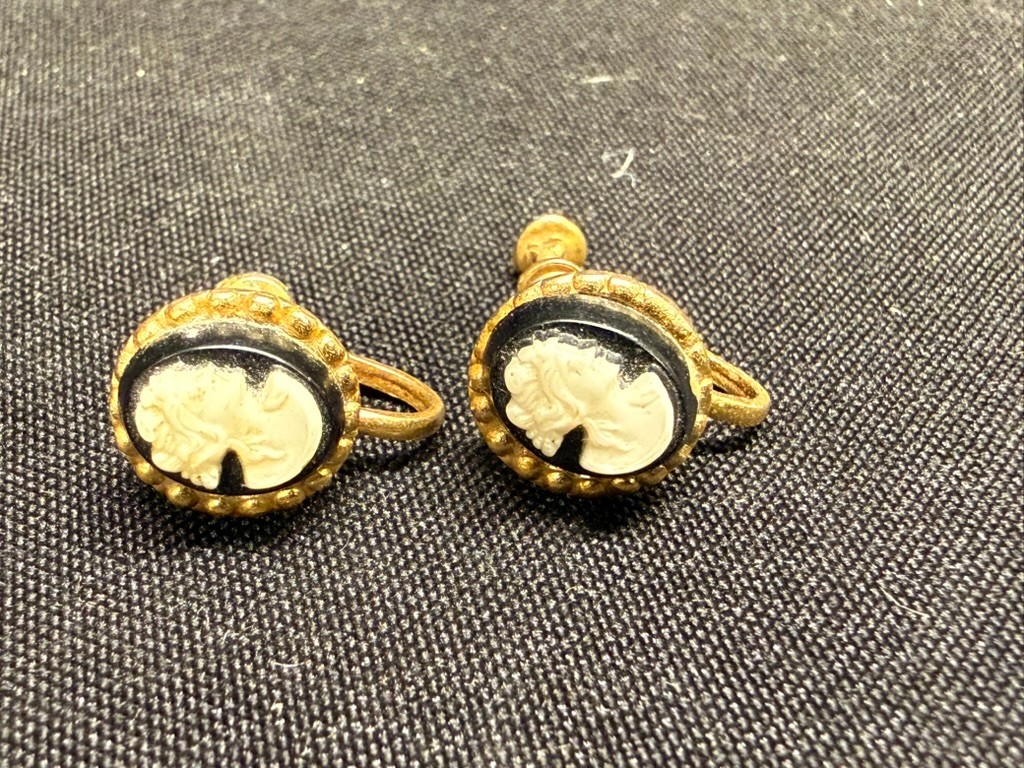 Vintage screw on cameo earrings black white & gold. It looks like the black may be onyx, but I can't say for sure. I do not think the gold is real gold, as there are no markings, but I'm not sure about that either. These were found in an old jewelry box with no other info. They need a good cleaning, but aside from that the seem to be in good vintage condition. Please make sure to look at pics closely.
