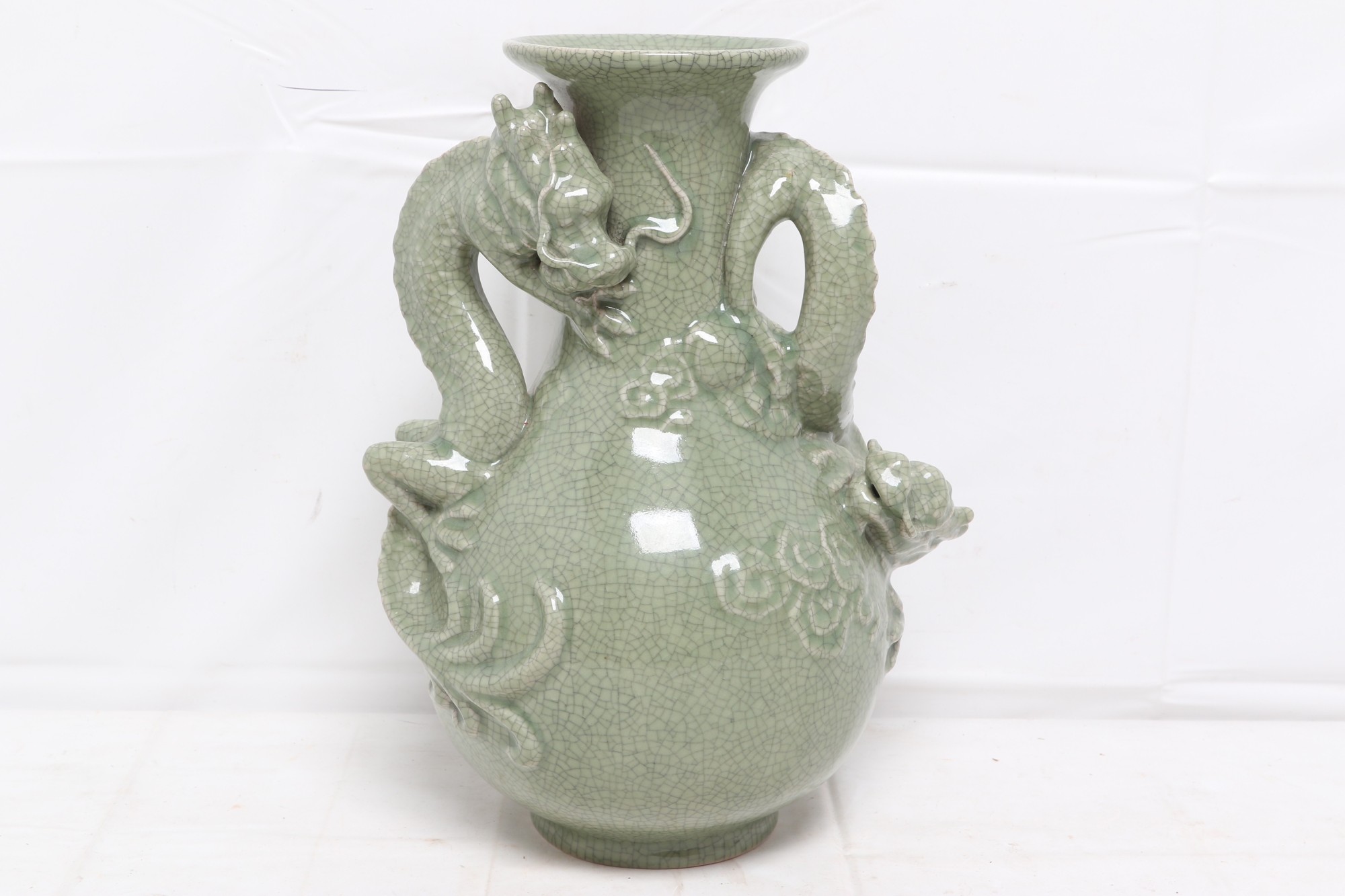 12" Chinese Celadon - Glazed Porcelain Dragon Vase