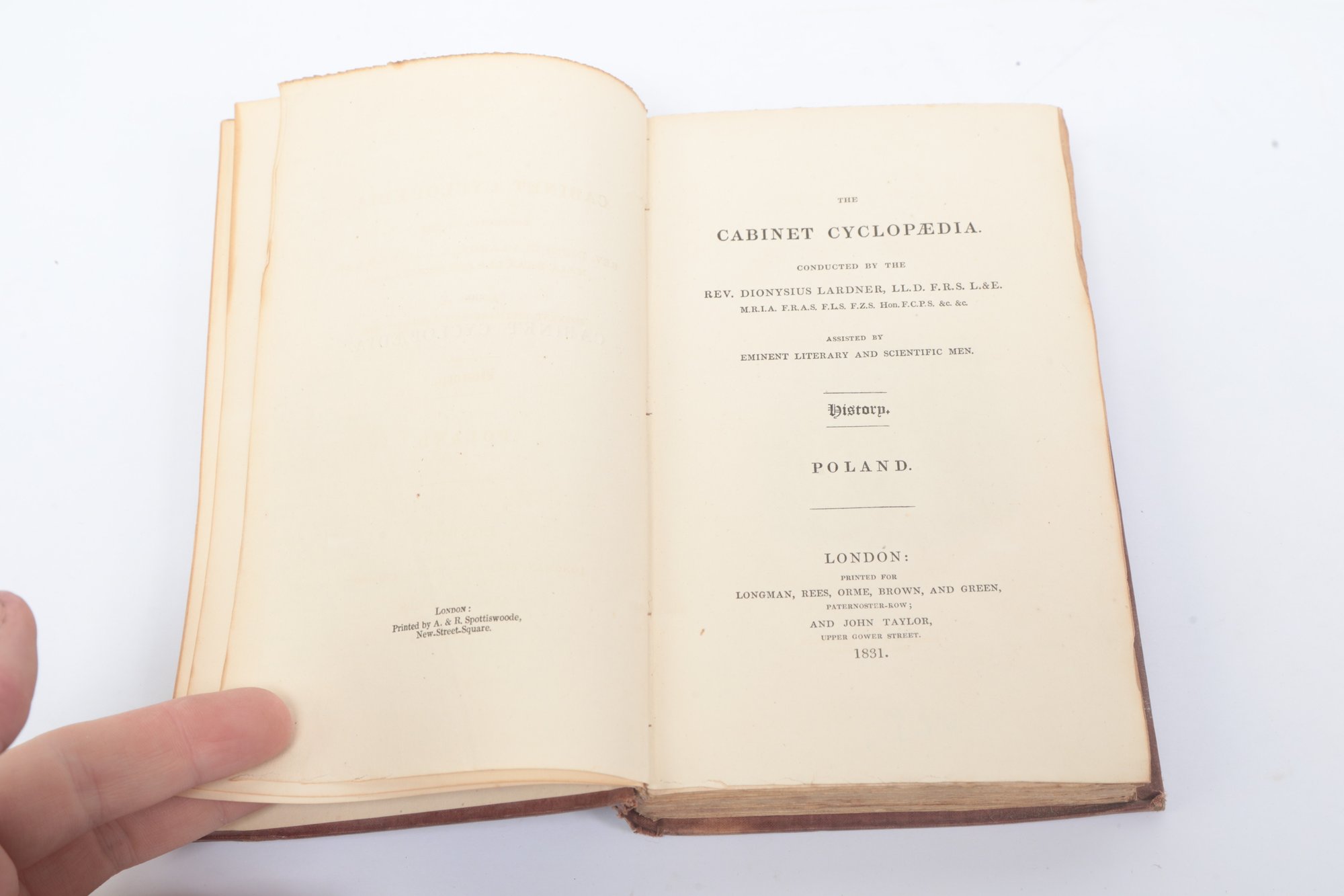 London: Printed for Longman, Rees, Orme, Brown, and Green, Paternoster-Row; and John Taylor, Upper Gower Street, 1831. The Cabinet Cyclopaedia, conducted by the Rev. Dionysius Lardner. History. Poland. Small 8vo. Publisher’s cloth, spine lettered, binding worn and faded with discoloration to spine and boards, corners rubbed. Text generally clean with light toning. An early volume from Lardner’s ambitious Cabinet Cyclopaedia series, presenting a concise nineteenth-century history of Poland for the general reader. Dionysius Lardner FRS FRSE (3 April 1793 – 29 April 1859) was an Irish scientific writer who popularised science and technology, and edited the 133-volume Cabinet Cyclopædia.