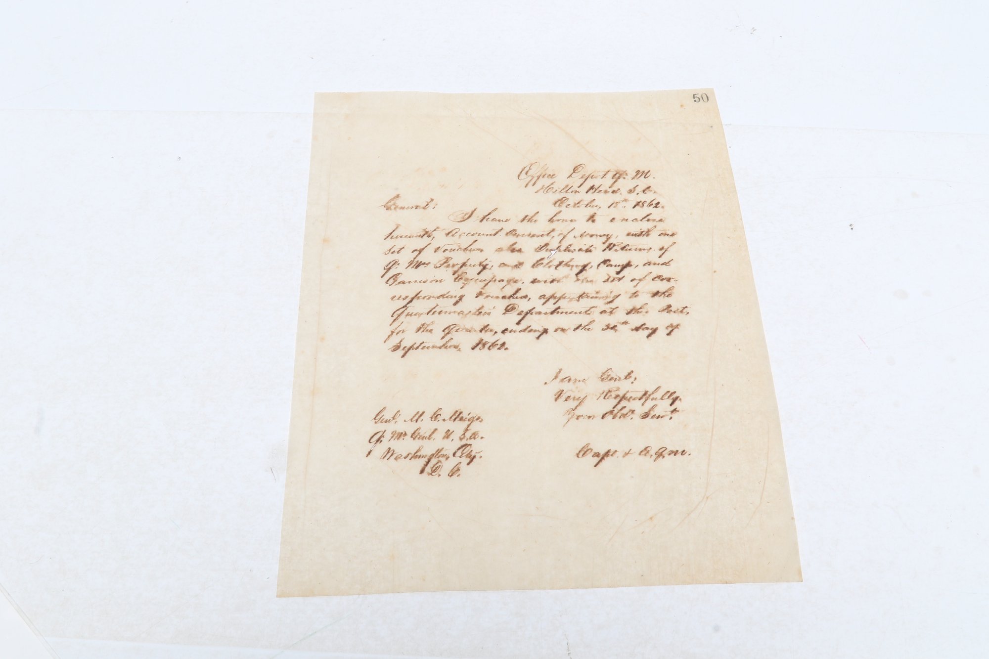 Description: A handwritten document Assistant Quartermaster General of the State of South Carolina, to the Adjutant General of the United States Army; includes an account current of financial transactions and a report on the proceedings of a board of inquiry regarding the appropriation for the Quartermaster's Department of South Carolina for the fiscal year ending September 30, 1862. Original “office copy”. View all photos FOR CONDITION before bidding.