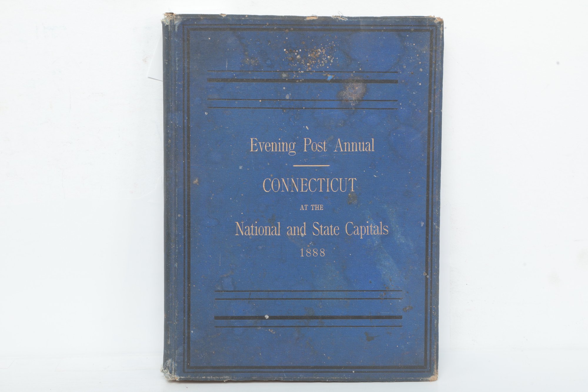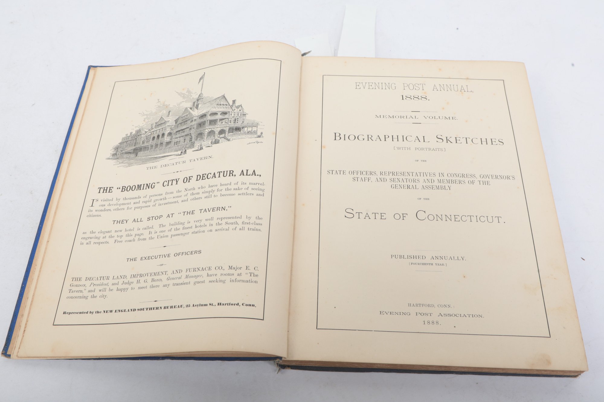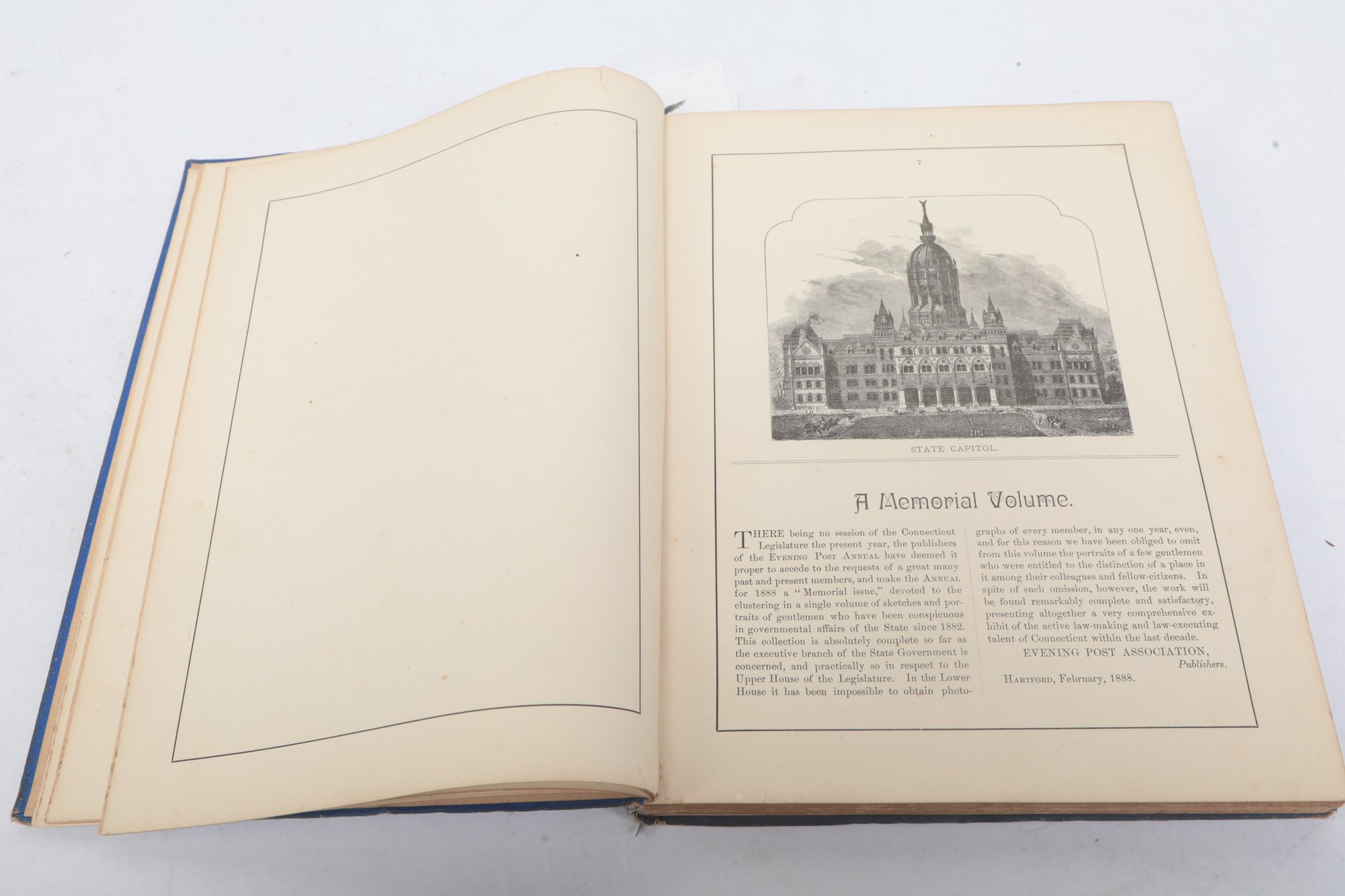 Hartford, Conn.: Evening Post Association, 1888. Evening Post Annual, 1888. Memorial Volume. Biographical Sketches [with Portraits] of the State Officers, Representatives in Congress, Governor’s Staff, and Senators and Members of the General Assembly of the State of Connecticut. Published annually (fourteenth year). Large quarto in original blue cloth, upper cover lettered in gilt within black-ruled borders; cloth heavily spotted and rubbed with wear at extremities and small chips at head and foot of spine. Illustrated throughout with engraved portraits and period advertisements, including full-page illustrated trade ads. Internally generally clean with occasional foxing. A substantial late nineteenth-century Connecticut political and biographical annual, rich in portraits and contemporary advertising.