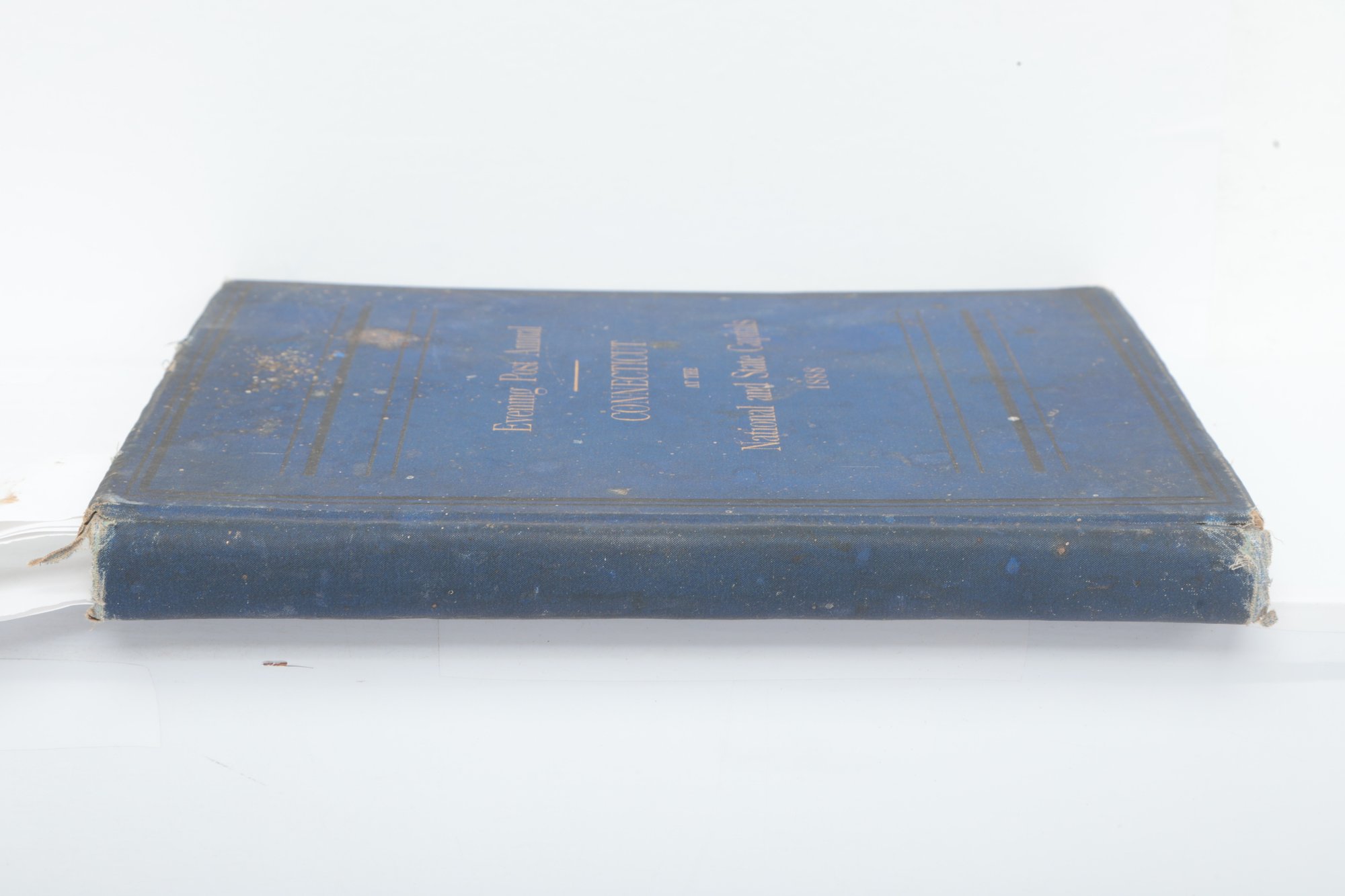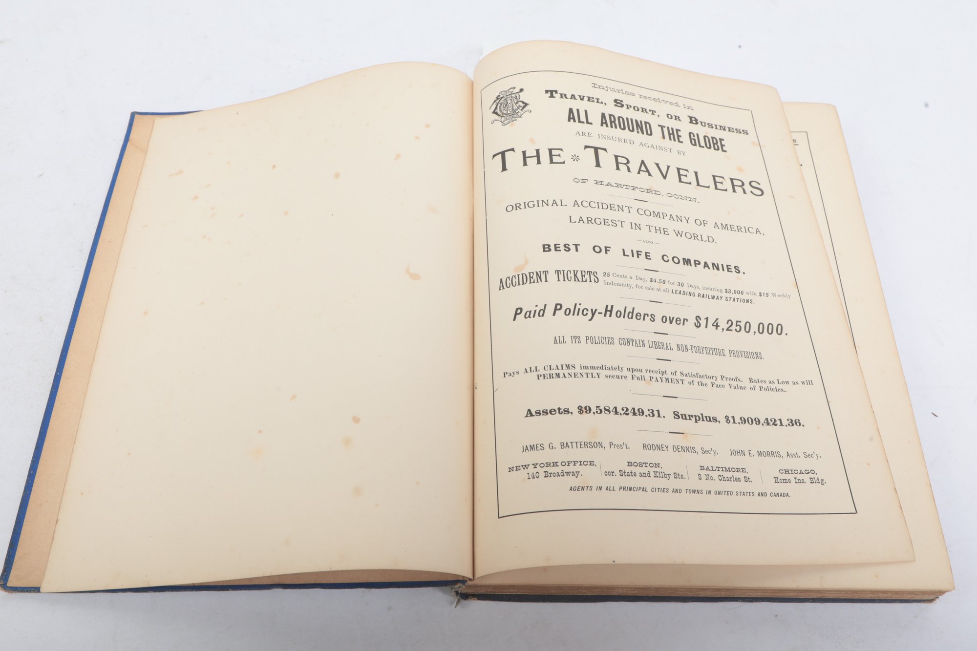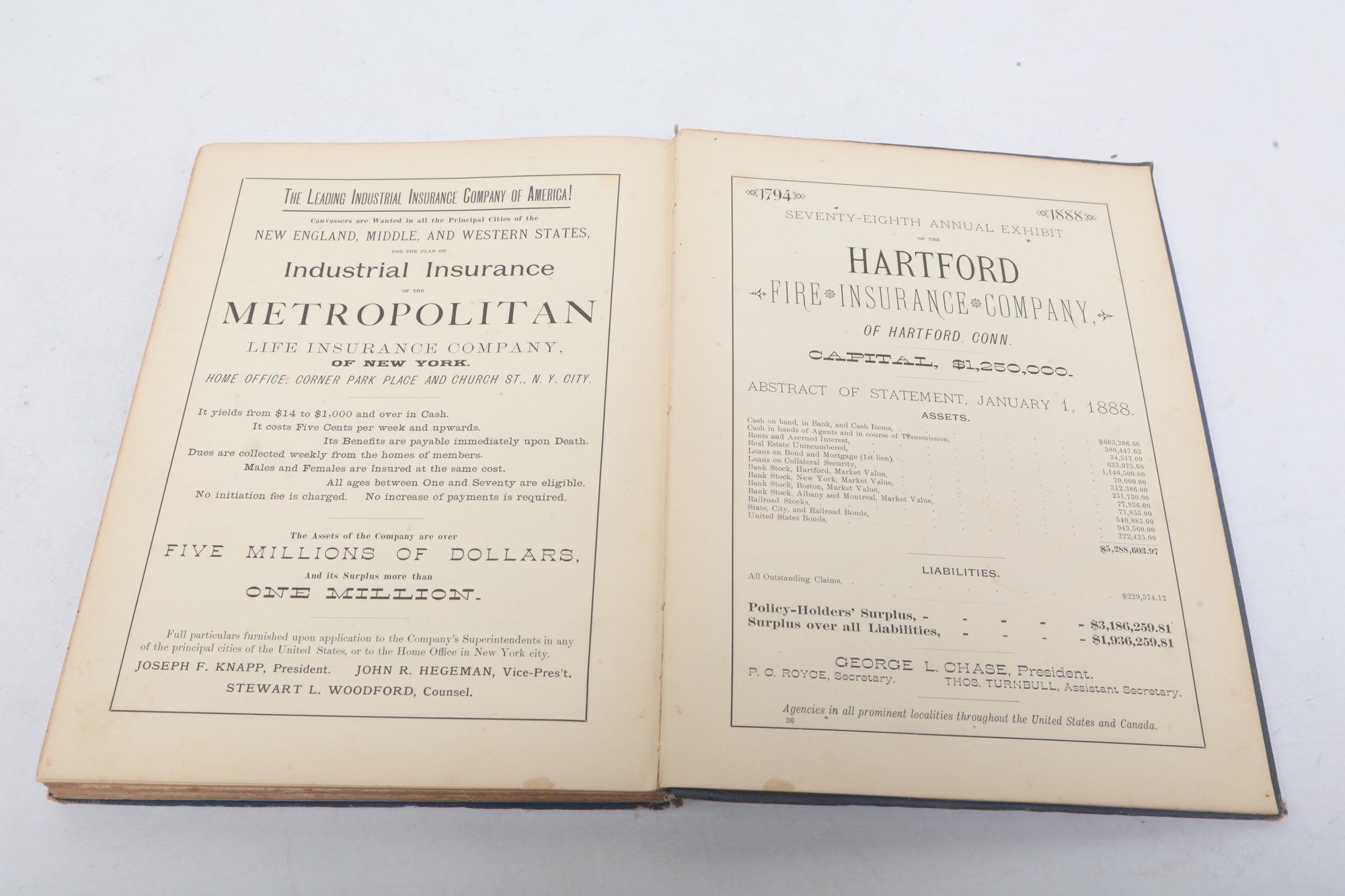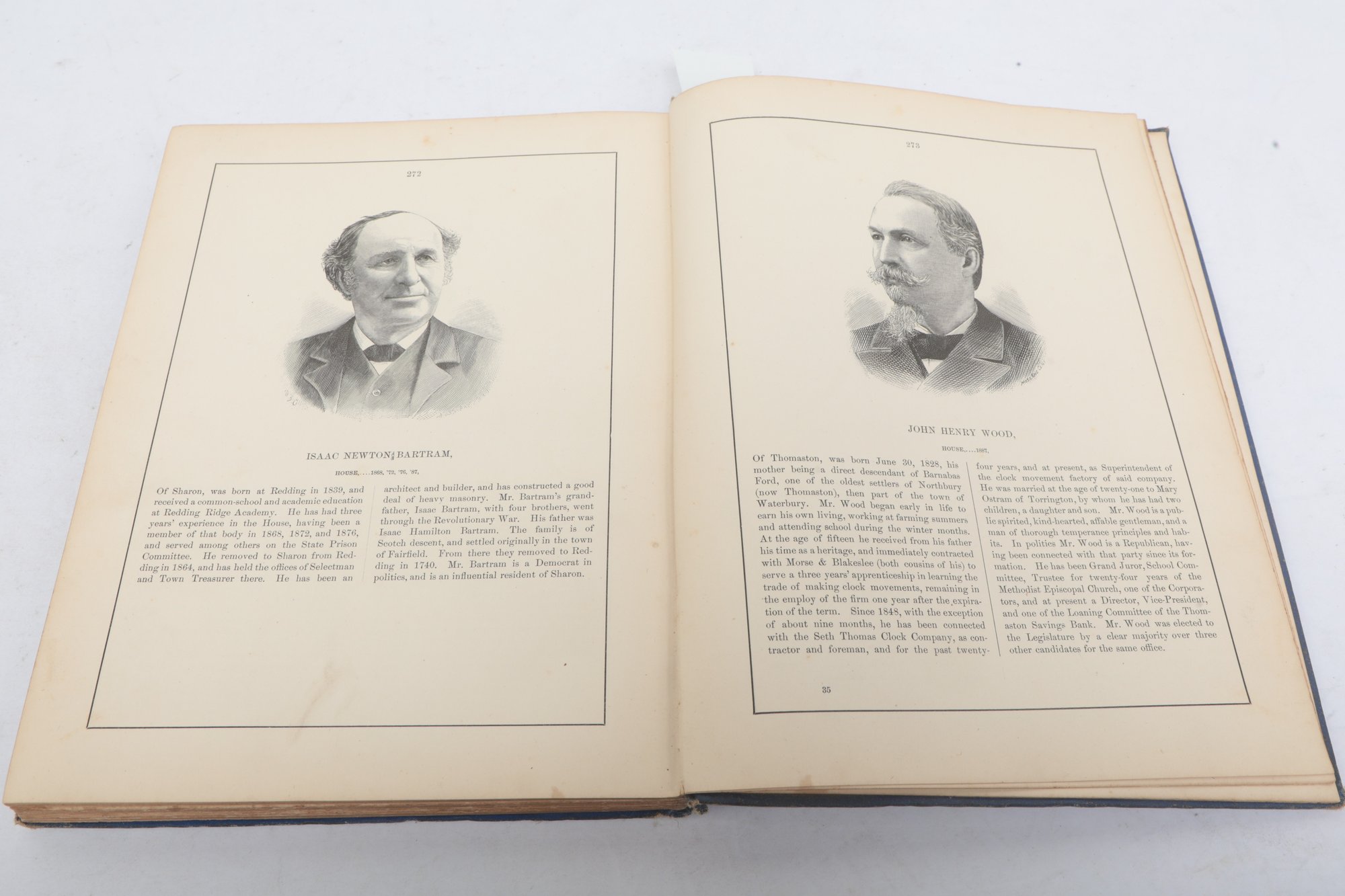 Hartford, Conn.: Evening Post Association, 1888. Evening Post Annual, 1888. Memorial Volume. Biographical Sketches [with Portraits] of the State Officers, Representatives in Congress, Governor’s Staff, and Senators and Members of the General Assembly of the State of Connecticut. Published annually (fourteenth year). Large quarto in original blue cloth, upper cover lettered in gilt within black-ruled borders; cloth heavily spotted and rubbed with wear at extremities and small chips at head and foot of spine. Illustrated throughout with engraved portraits and period advertisements, including full-page illustrated trade ads. Internally generally clean with occasional foxing. A substantial late nineteenth-century Connecticut political and biographical annual, rich in portraits and contemporary advertising.