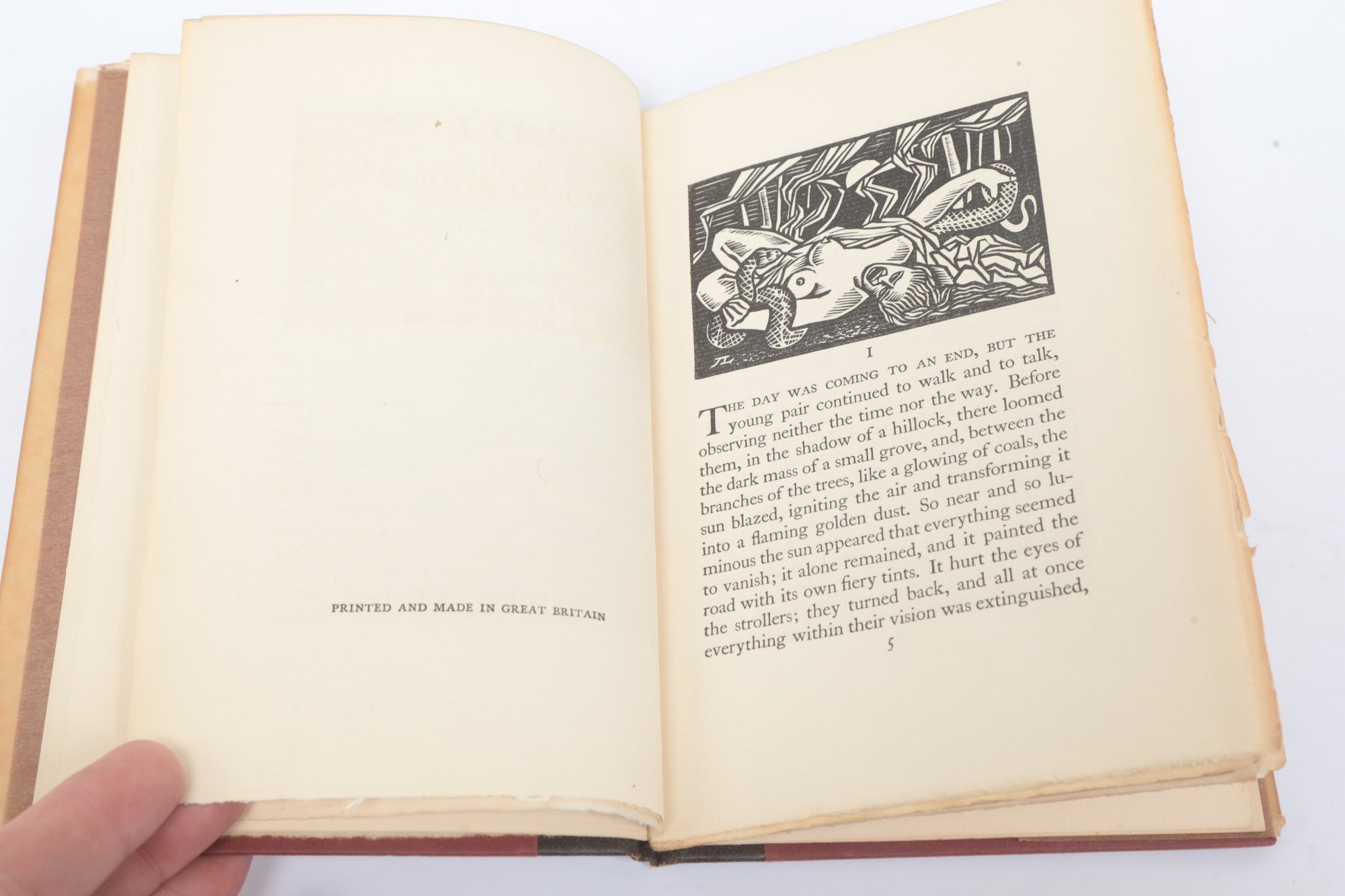 London: The Golden Cockerel Press, 1929. Small 4to. Abyss by Leonid Andreyev, translated by John Cournos, with engravings by Ivan Lebedeff. VG in original quarter cloth over paper-covered boards, under plain paper dust wrapper, the wrapper worn and chipped at edges with losses at spine, binding clean and firm. Interior bright and fresh, engravings strong and well printed. A finely produced Golden Cockerel Press edition, illustrated with Lebedeff’s striking wood engravings.