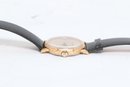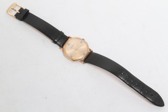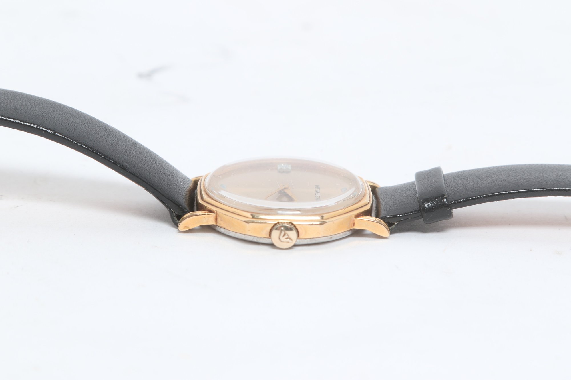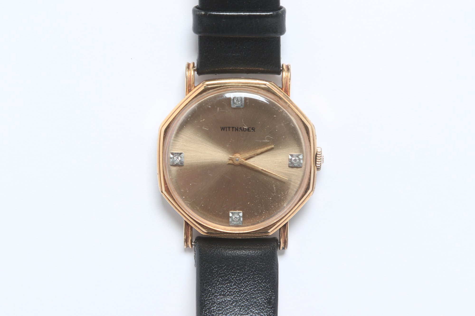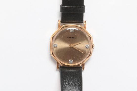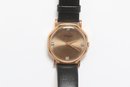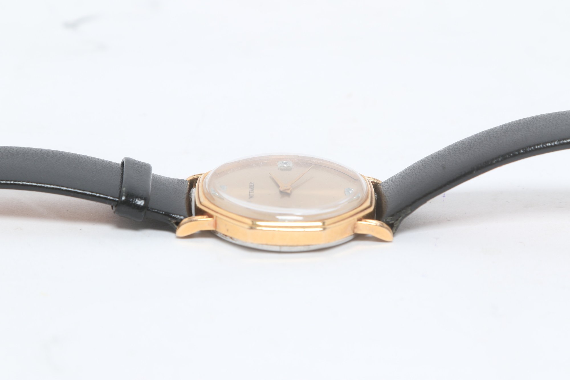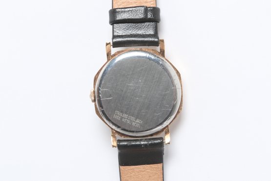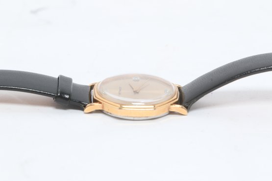 Vintage 1960s Wittnauer mechanical wristwatch with gold tone case, champagne dial, and black leather strap. Features classic styling with applied hour markers. Tested and running well; shows light wear consistent with age.