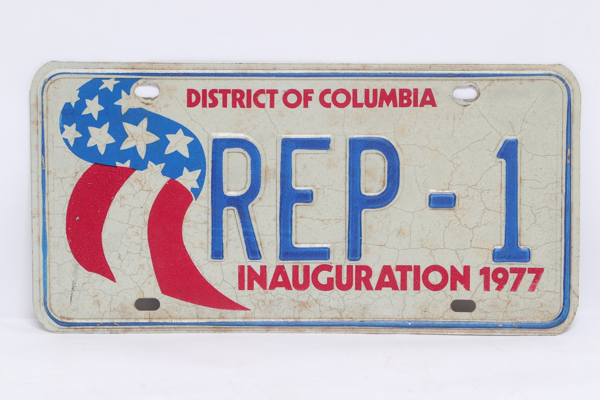 District of Columbia inauguration license plate marked “REP-1” from 1977, featuring a patriotic eagle and flag design. Shows surface wear, scratches, and age toning—solid collectible for political or license plate enthusiasts.